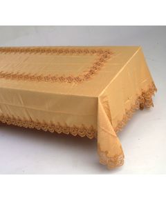 Скатерть 150х270 см украшена по середине и по краям кружевом с волнистыми краями, горчичного цвета, полиэстер 100% Эта изысканная скатерть идеально дополнит ваш стол, придавая ему элегантность и утонченность. Горчичный оттенок придает комнате тепло и уют, а кружевное украшение по...