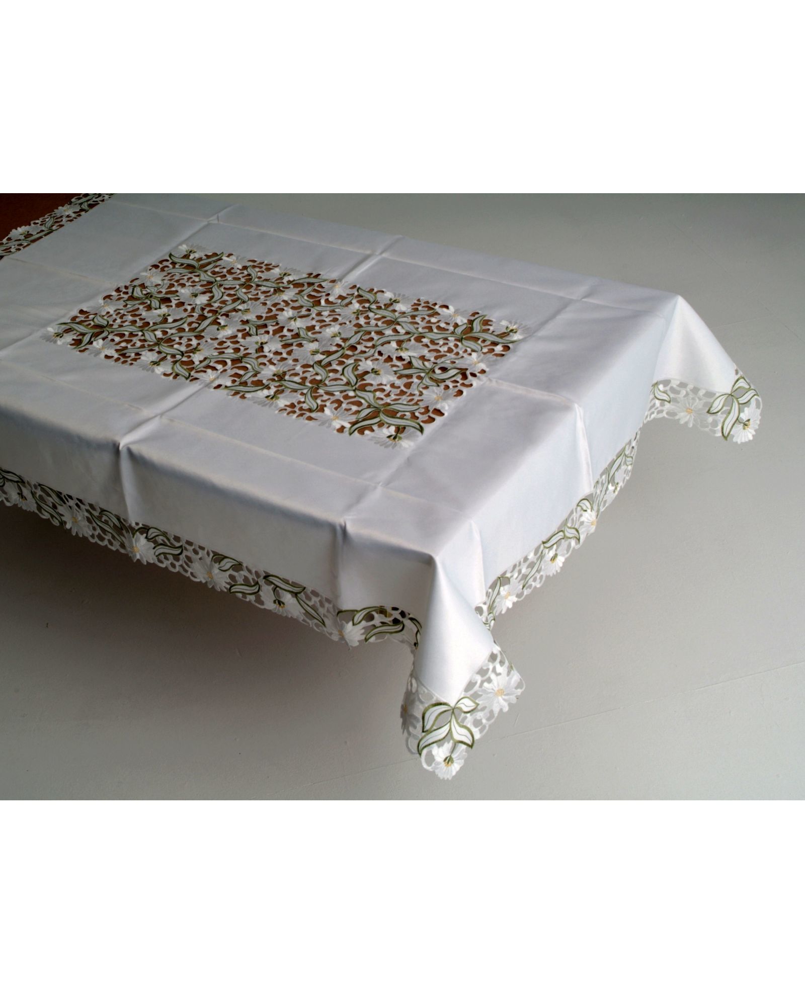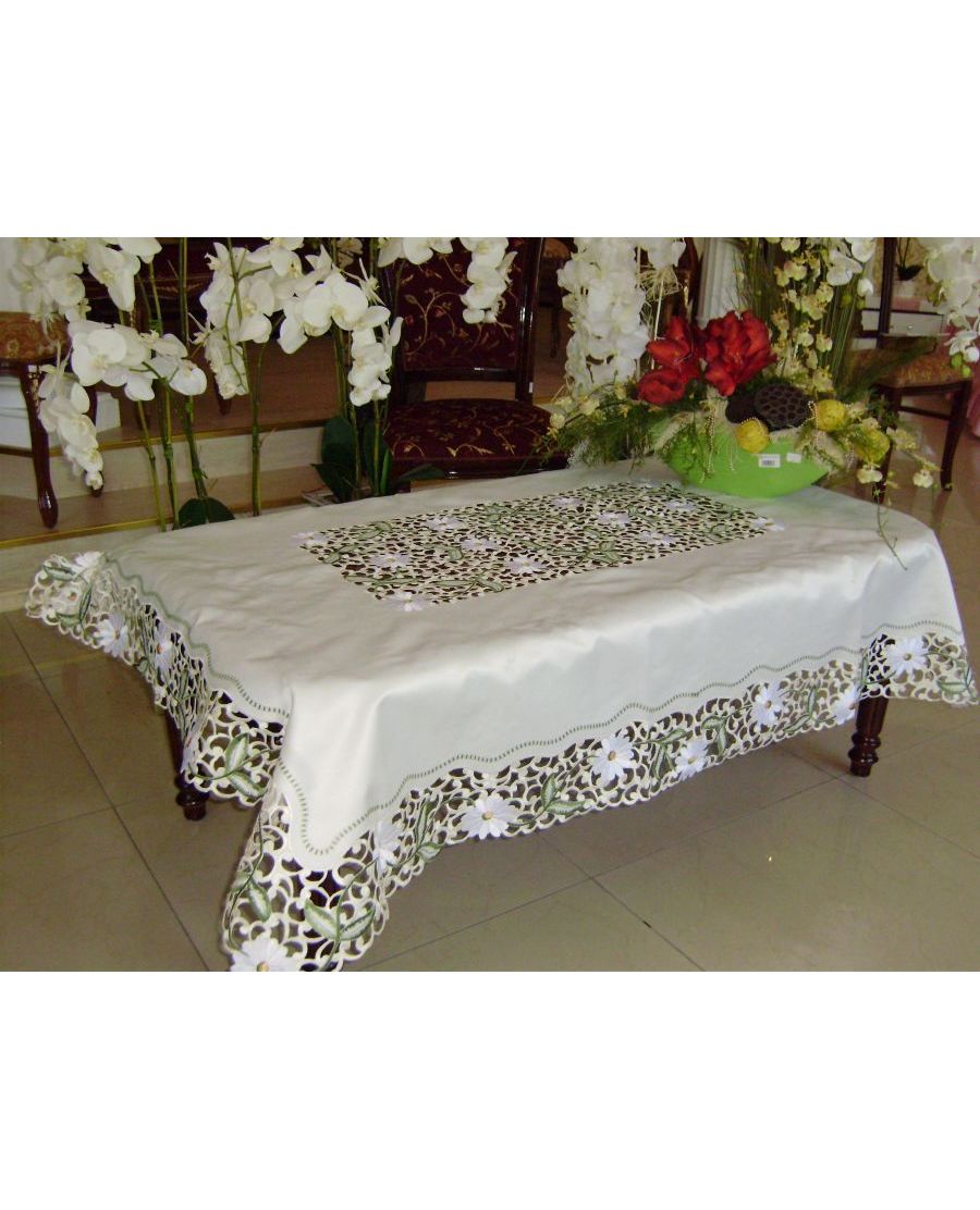 Скатерть 160х260 см с вышитыми ромашками и ажурными волнистыми краями, молочного цвета