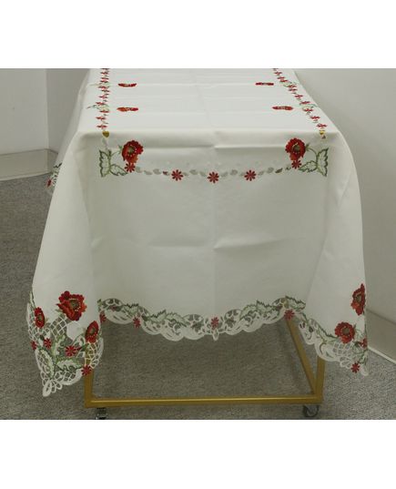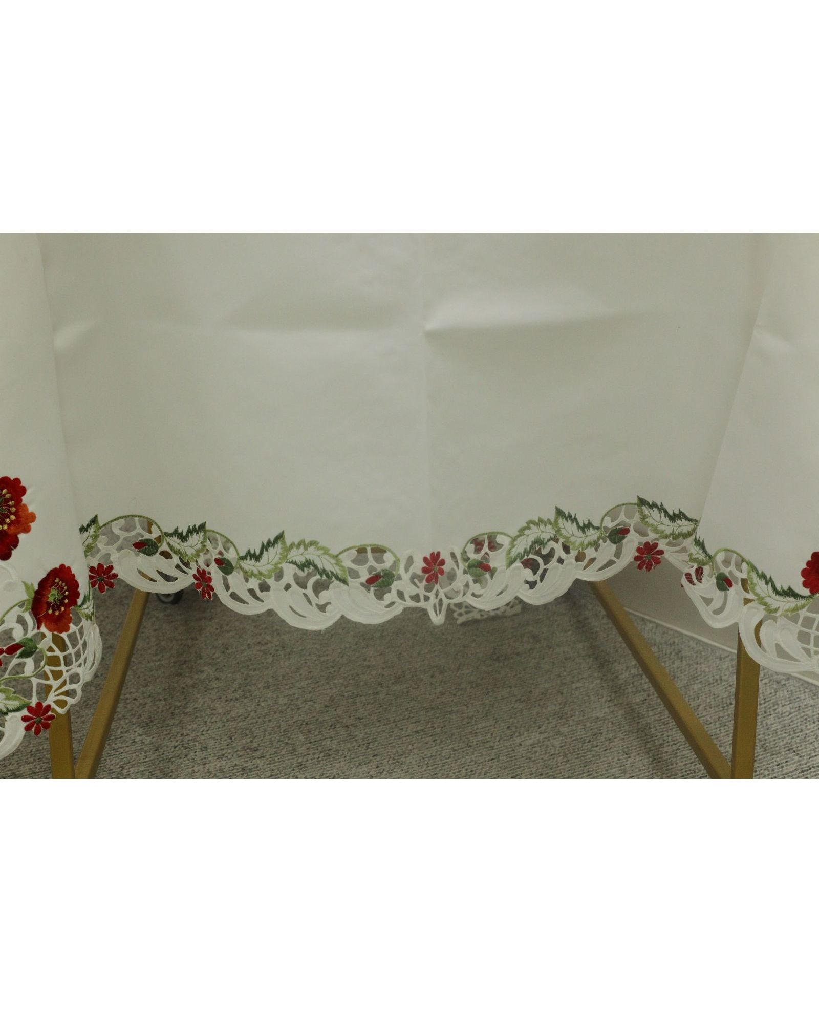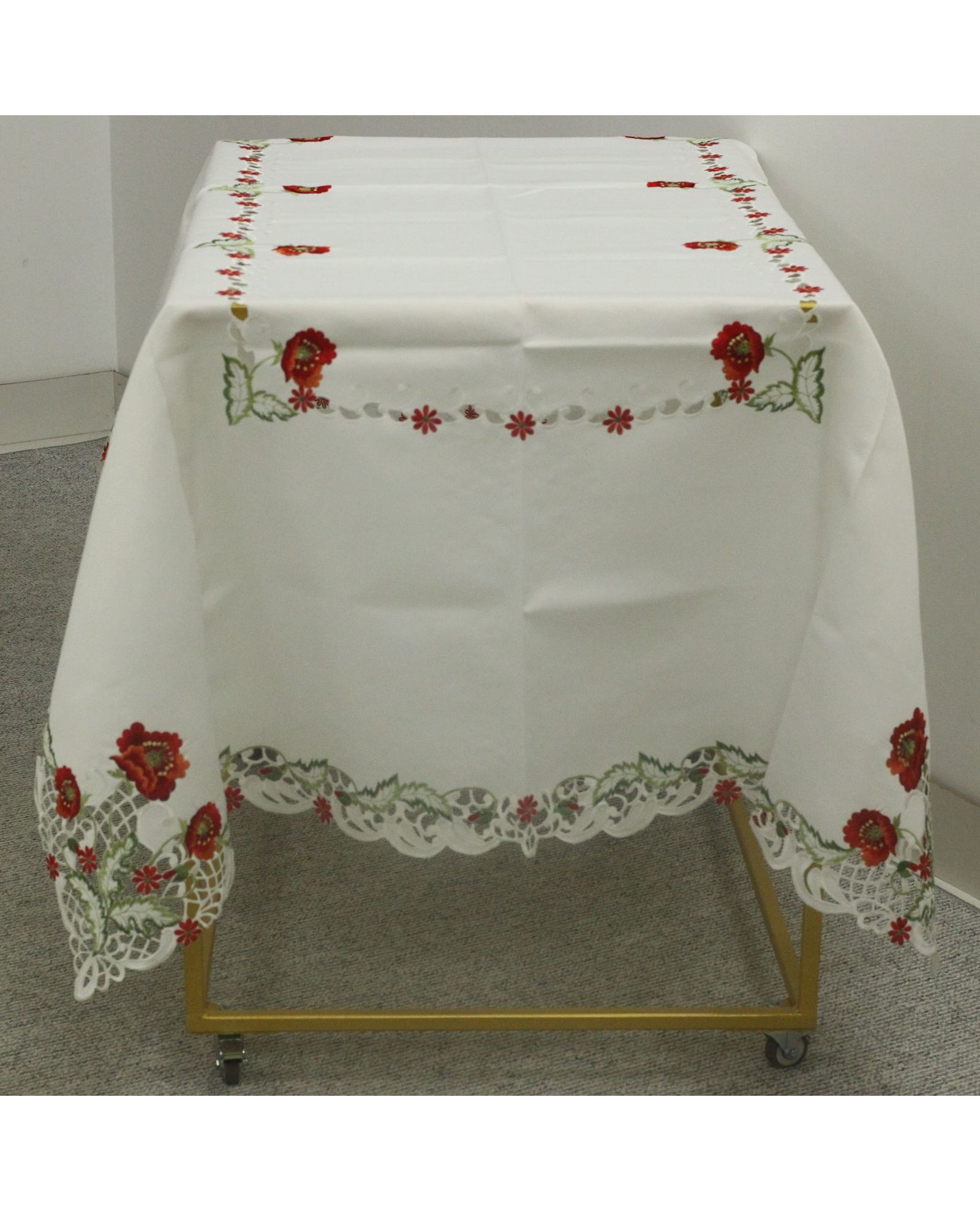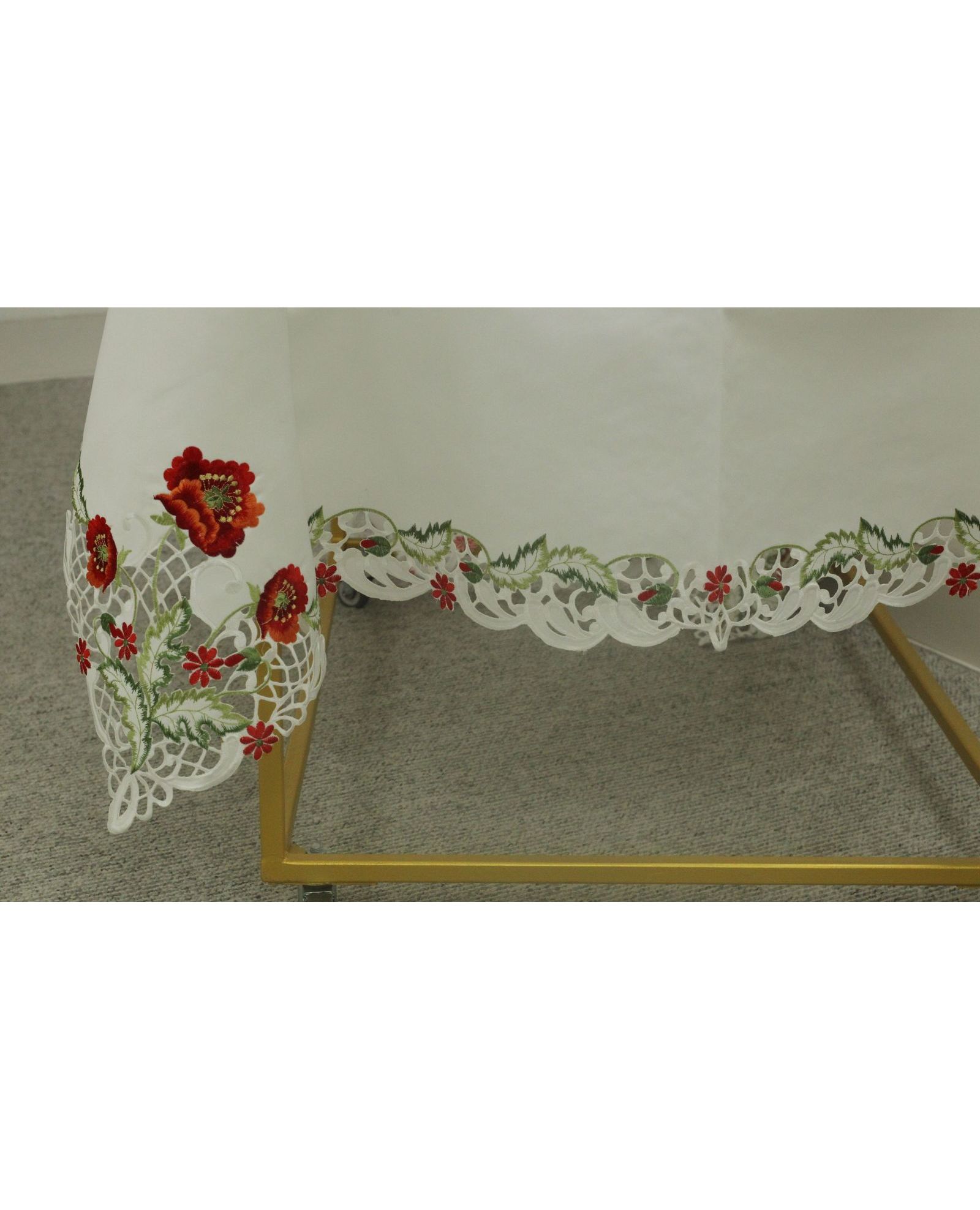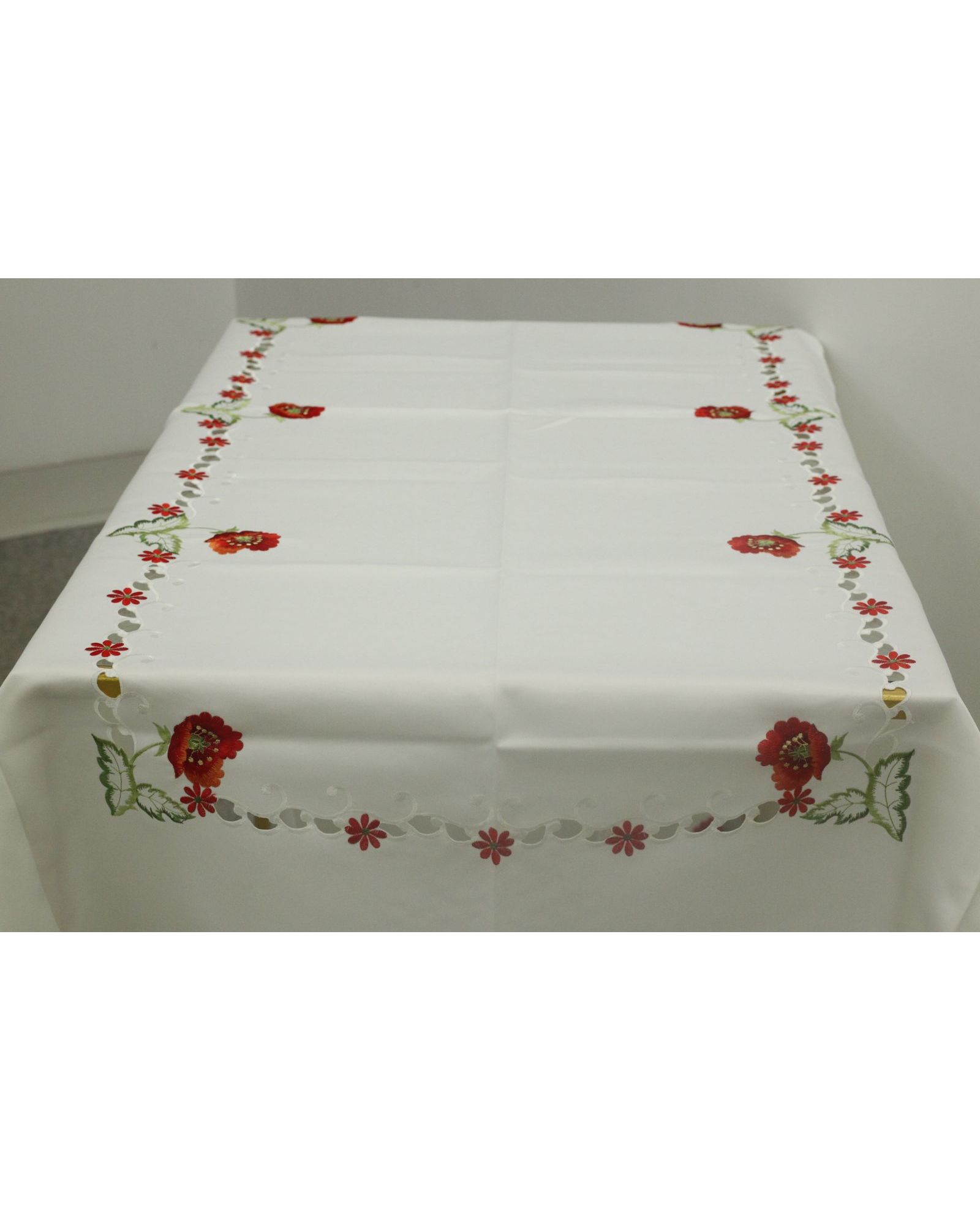 Скатерть 160х260 см с вышитыми цветами маков и ажурными волнистыми краями, белого цвета