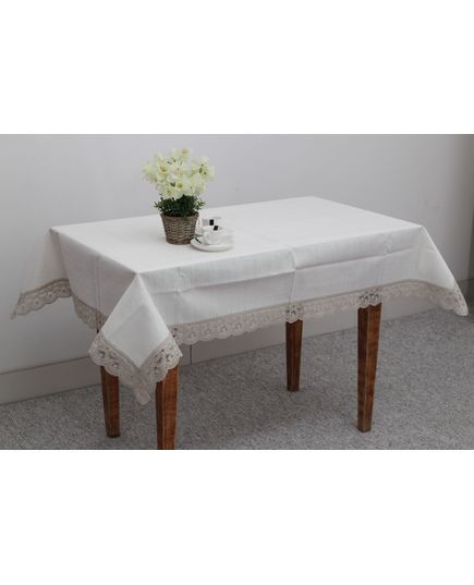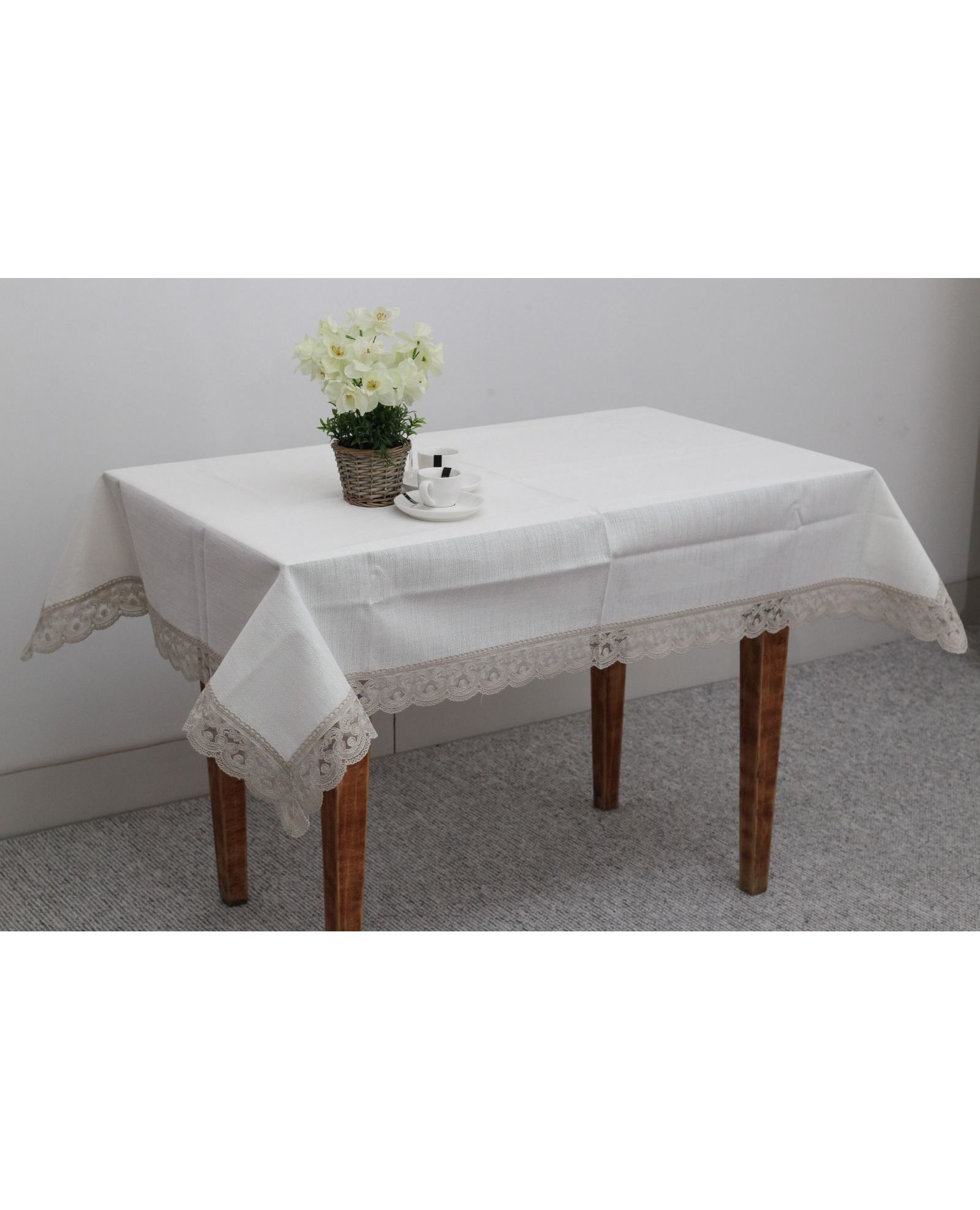 Скатерть 160х260 см с кружевной отделкой по краям, бежевого цвета с золотистой нитью.
