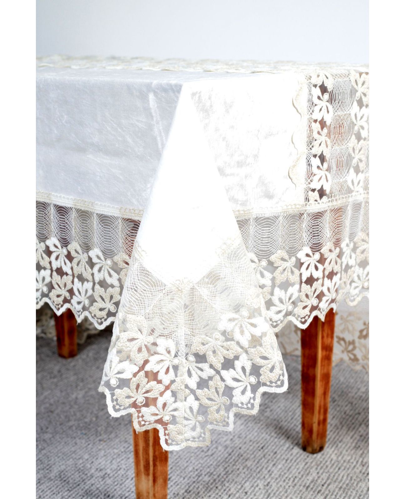 Эта элегантная скатерть молочного цвета идеально дополнит ваш интерьер. Бархатная текстура придаёт изделию роскошный вид, а кружевное украшение по середине и волнистые края добавляют изысканности и нежности. Изготовленная из высококачественного бархата, эта скатерть сочетает стиль, комфорт и практичность. Она не только прекрасно выглядит, но и легко ухаживается. Производитель Турция гарантирует высокое качество.