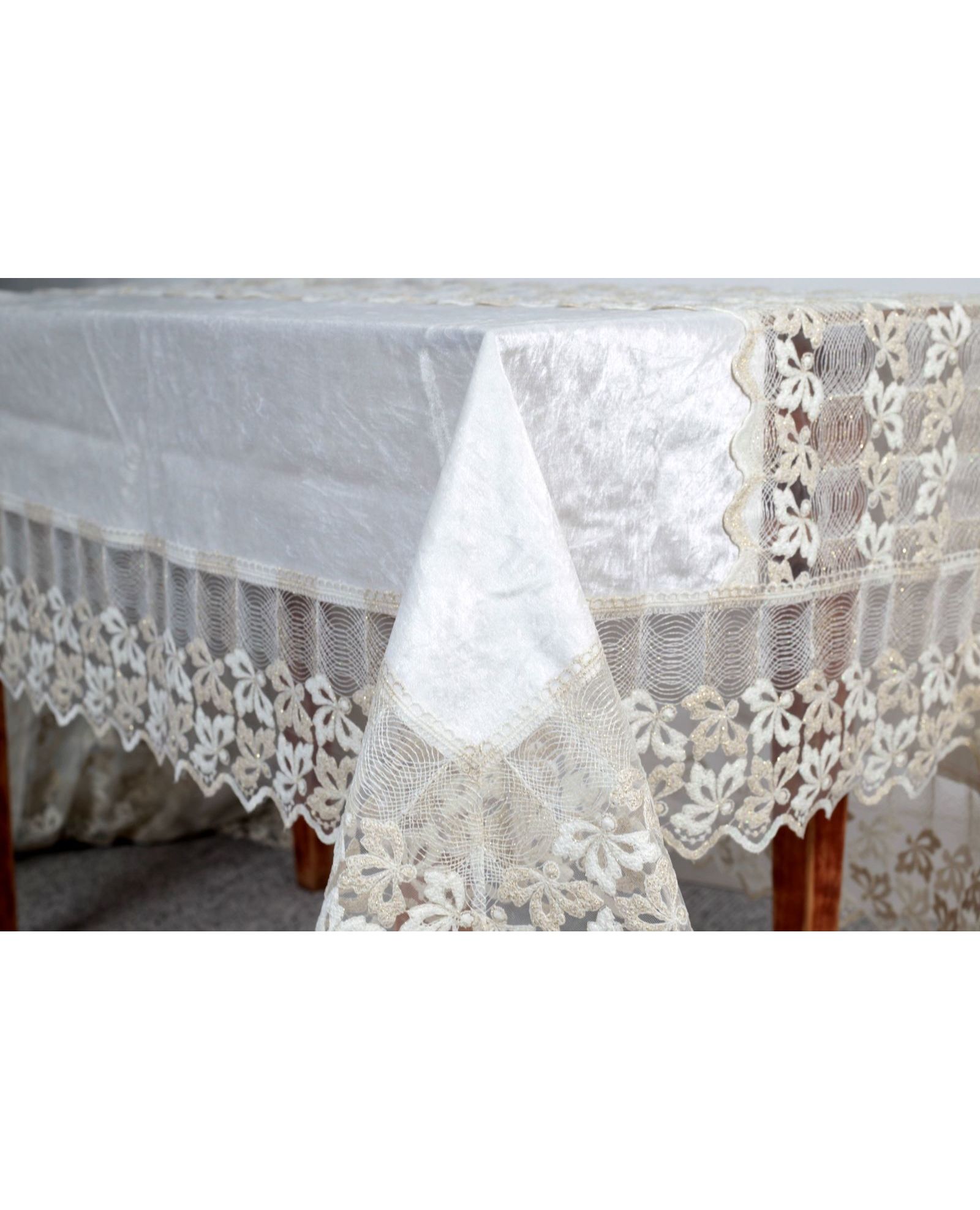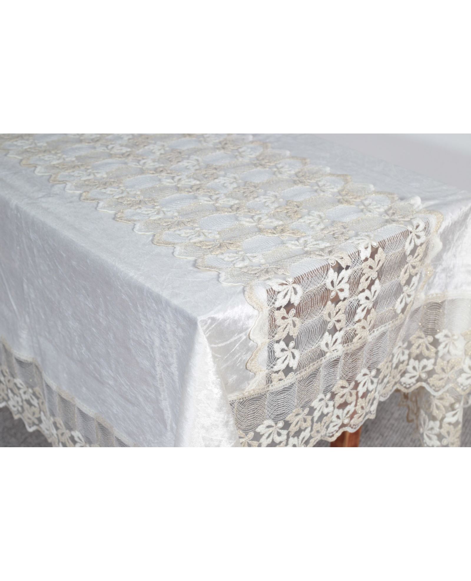 Скатерть 160х260 см, украшена кружевом по середине и волнистыми краями, бархат, молочного цвета.