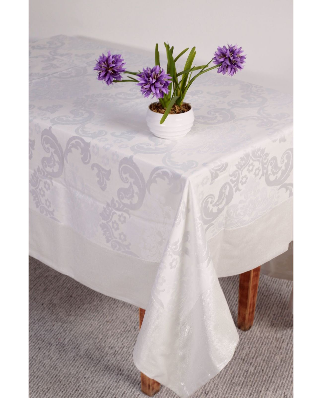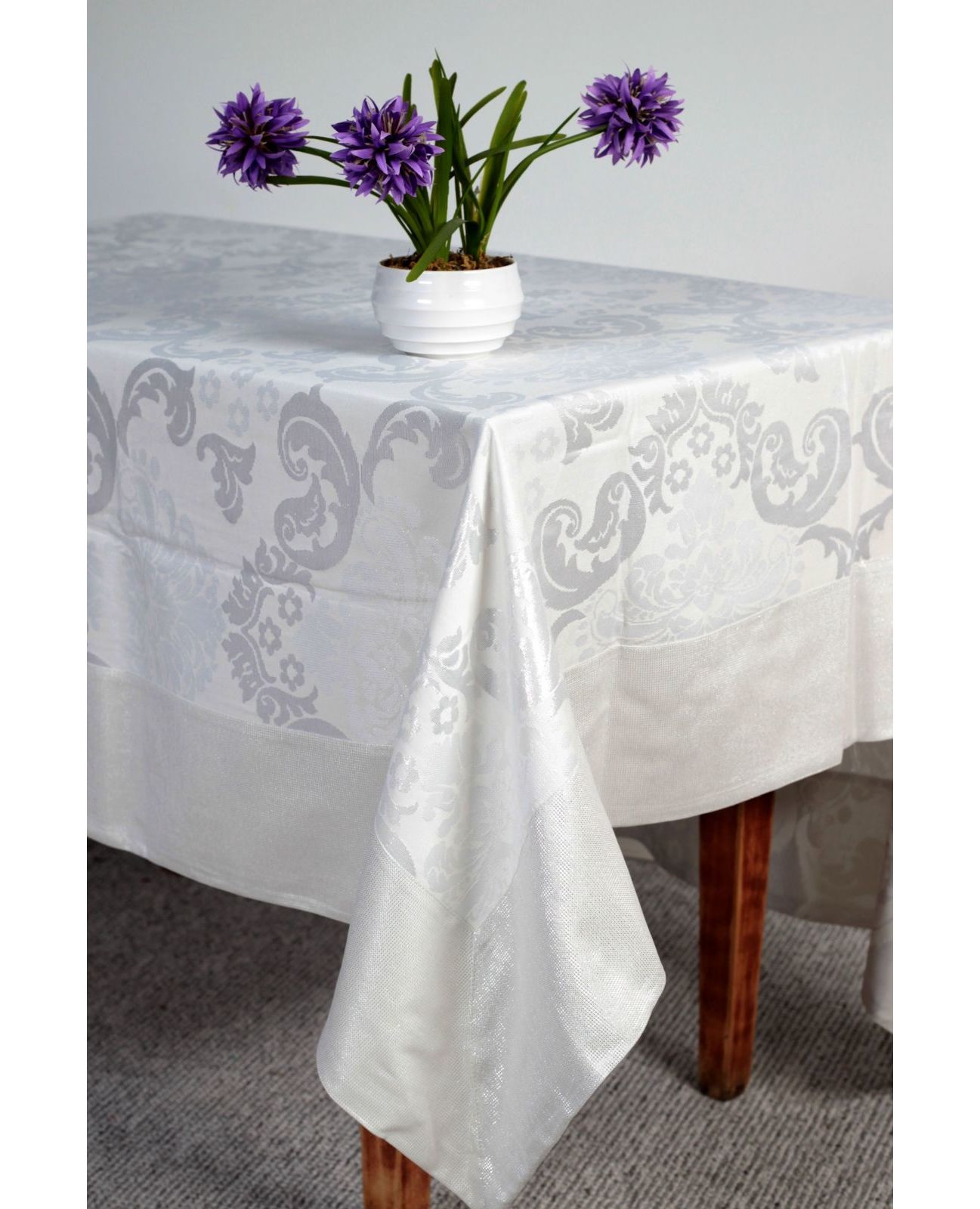 Эта роскошная скатерть придаст вашему столу изысканности и стиля. Серебристый оттенок гармонично сочетается с утончённым узором, создавая элегантную атмосферу. Оригинальные кисточки по углам добавляют особого шарма и завершают образ. Изготовленная в Турции из высококачественного полиэстера, скатерть отличается прочностью, простотой в уходе и долговечностью. Она станет идеальным дополнением как для праздничных мероприятий, так и для повседневной сервировки стола.