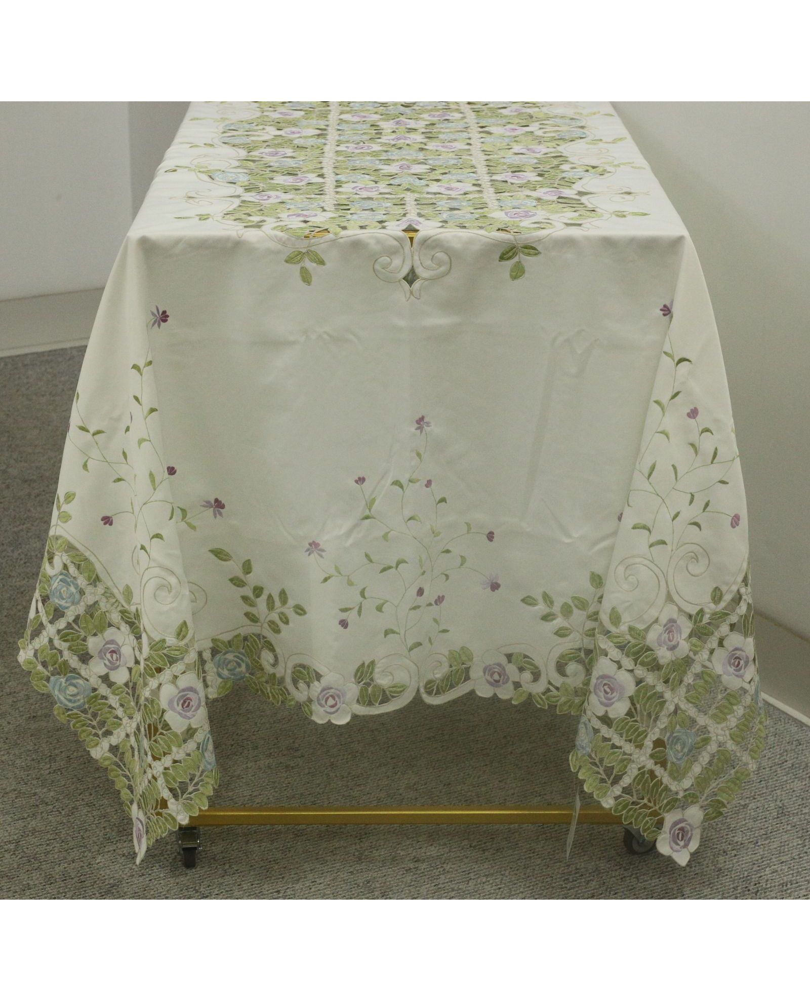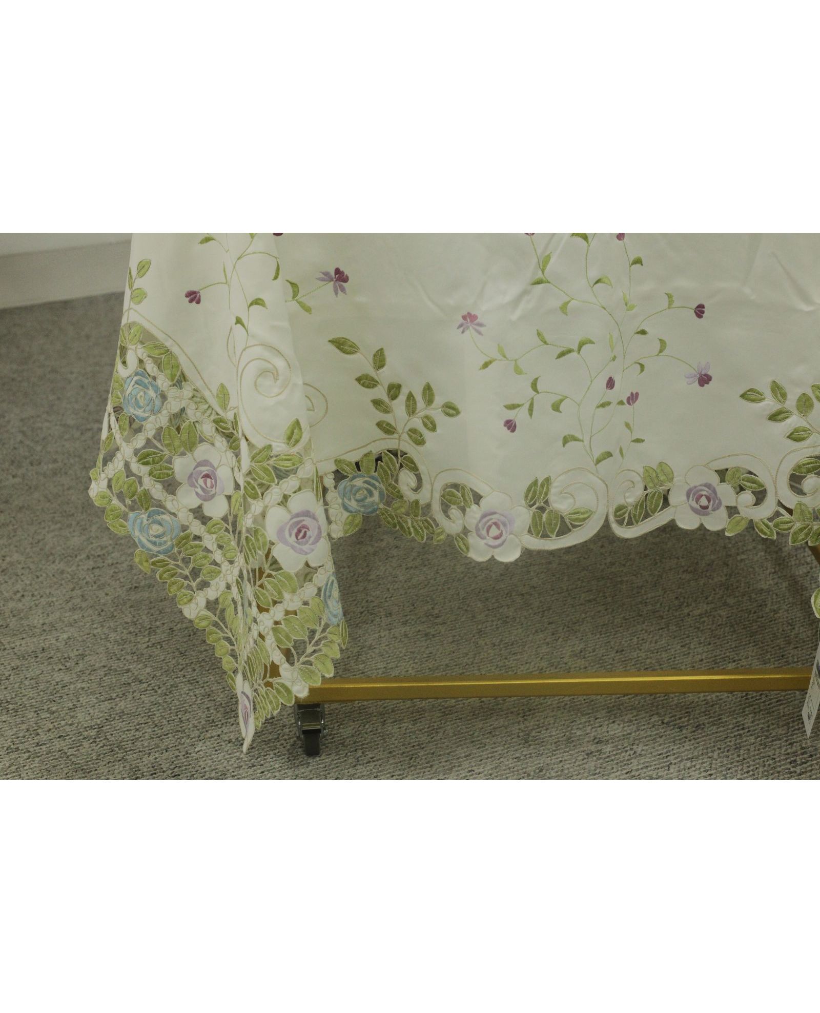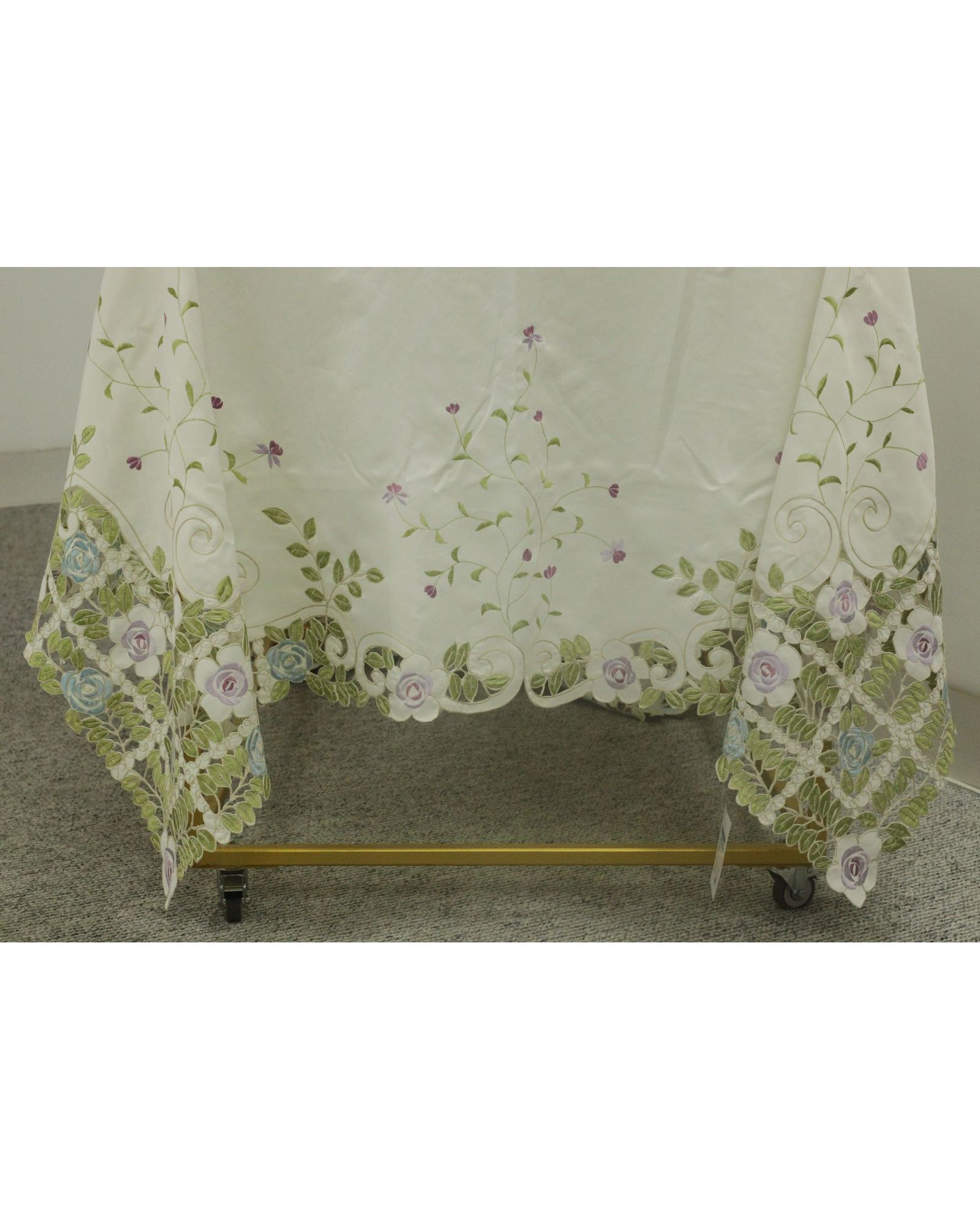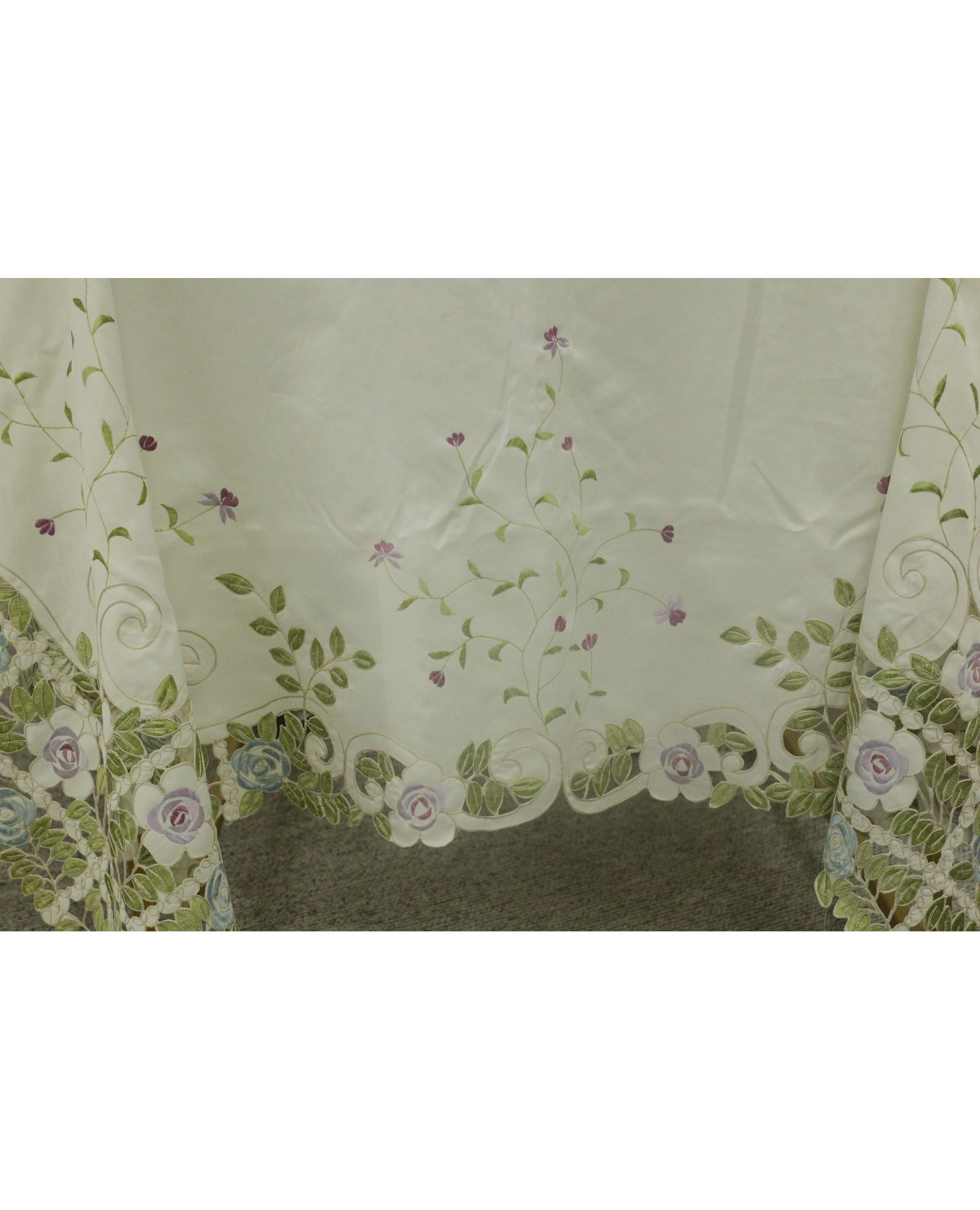 Скатерть 180х270 см ажурная с яркой вышивкой и волнистыми краями, полиэстер 100%, белого цвета