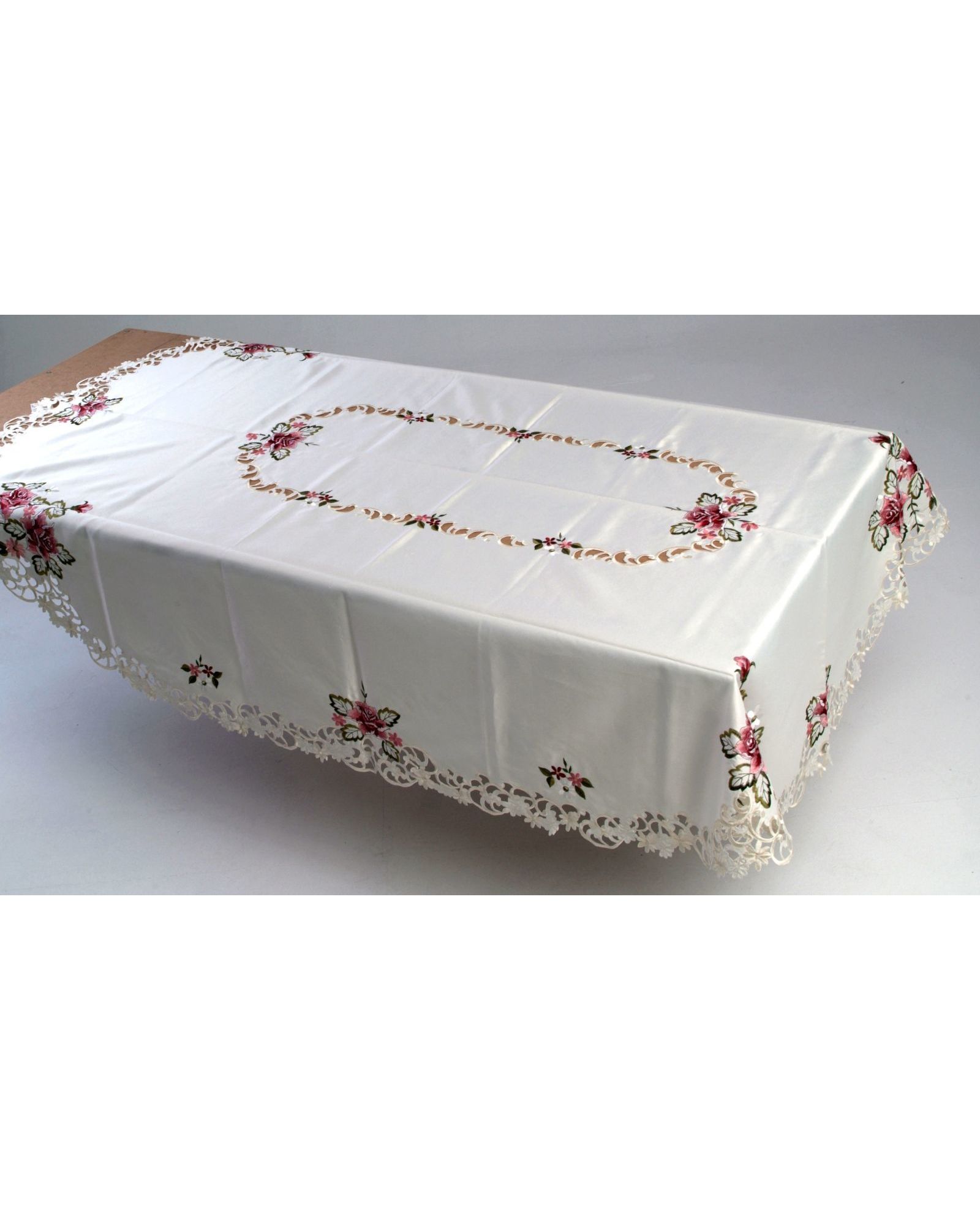 Скатерть 160х260 см с вышитыми цветами и ажурными волнистыми краями, молочного цвета, на овальный стол