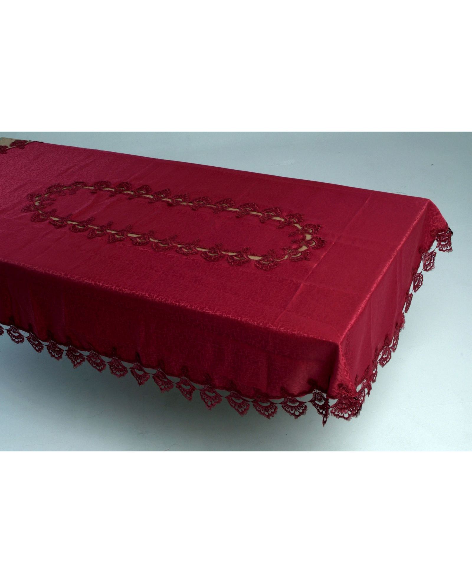 Скатерть 150х270 см украшена по середине и по краям кружевом с волнистыми краями, бордового цвета, полиэстер 100% на овальный стол