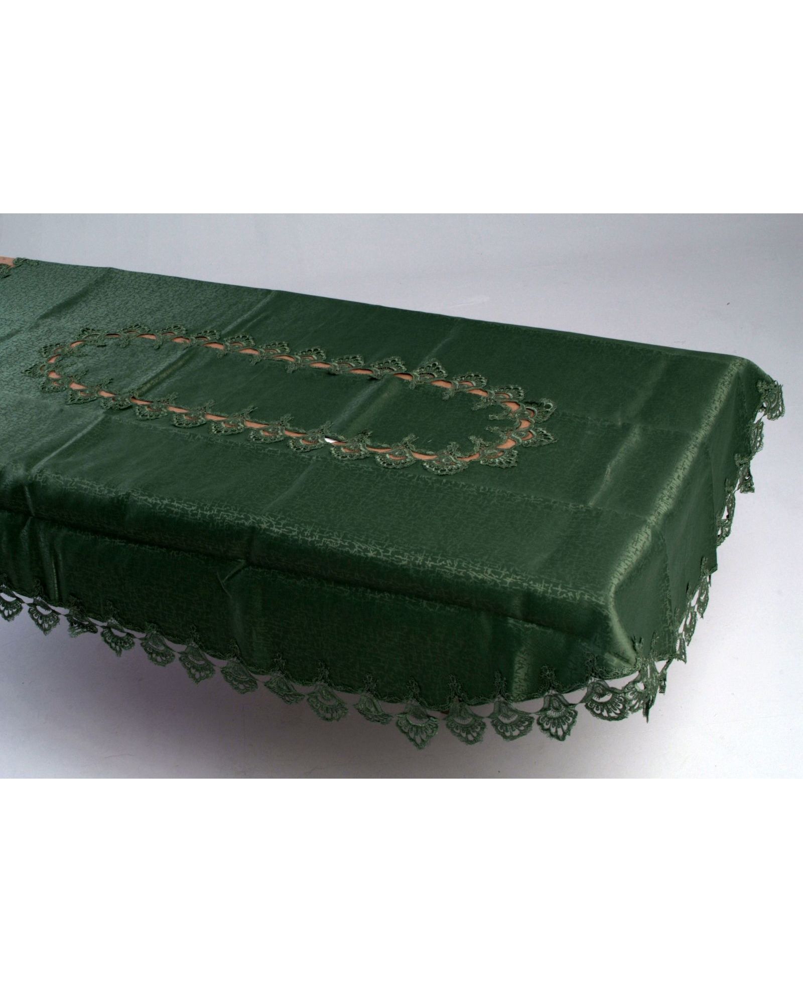 Скатерть 150х271 см украшена по середине и по краям кружевом с волнистыми краями, зелёного цвета, полиэстер 100% на овальный стол