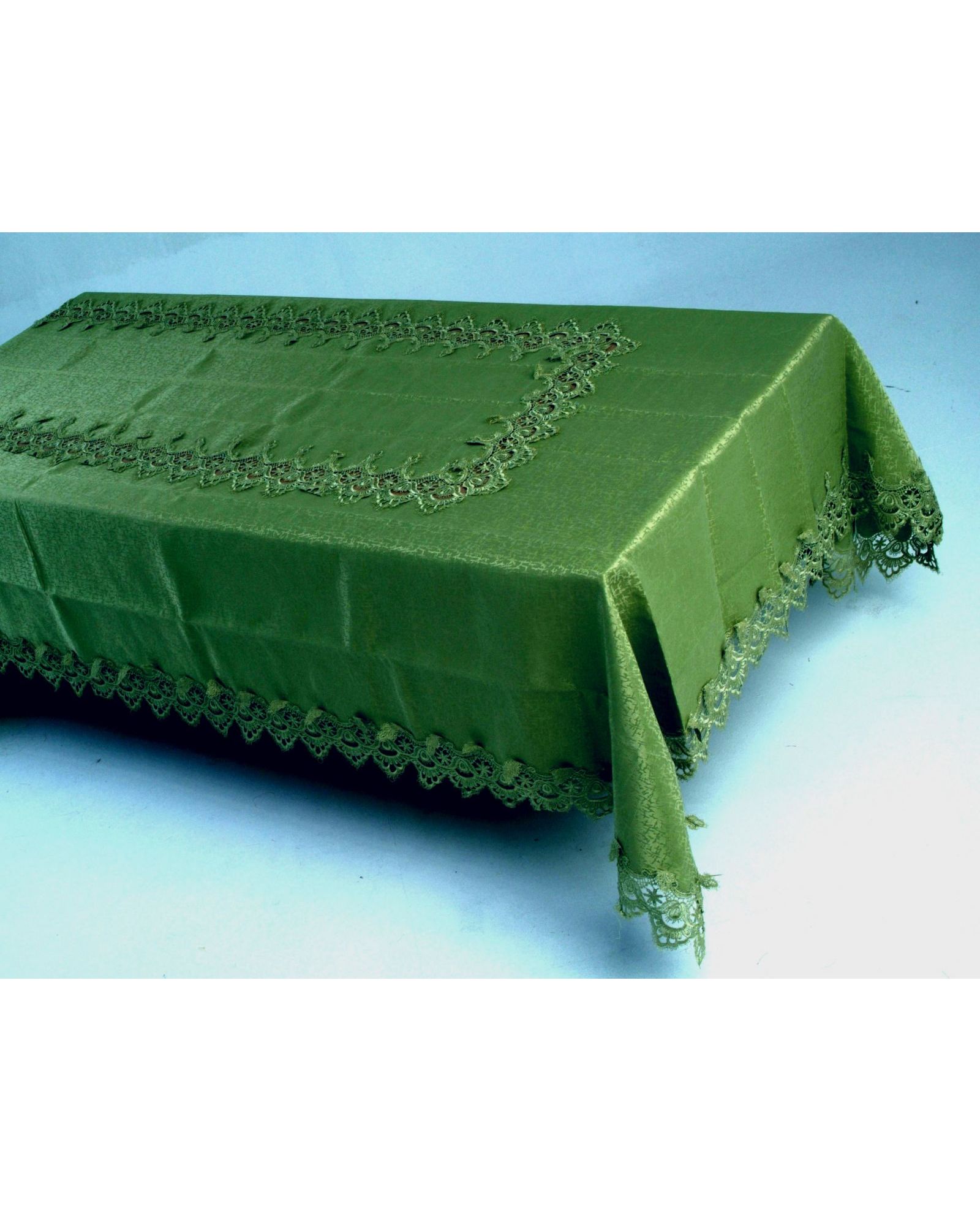 Скатерть 180х320 см, украшенная кружевом и волнистыми краями, полиэстер 100%, зелёного цвета