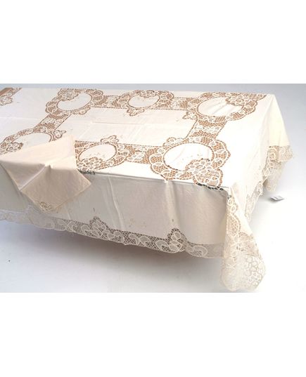 Скатерть размером 180х320 см, украшенная по середине и по краям изысканным кружевом и элегантной вышивкой. Изготовлена из 100% хлопка, что гарантирует высокое качество и долговечность. Бежевый цвет придает изысканность и легко сочетается с различными интерьерами.