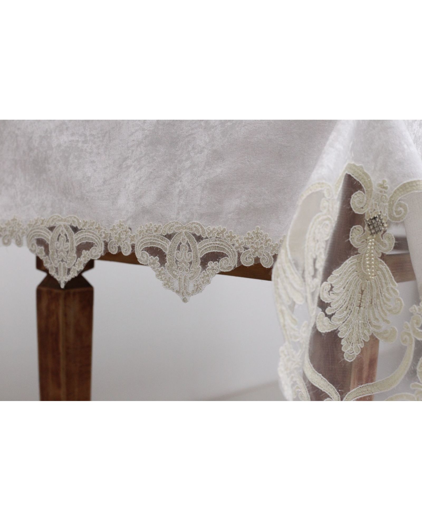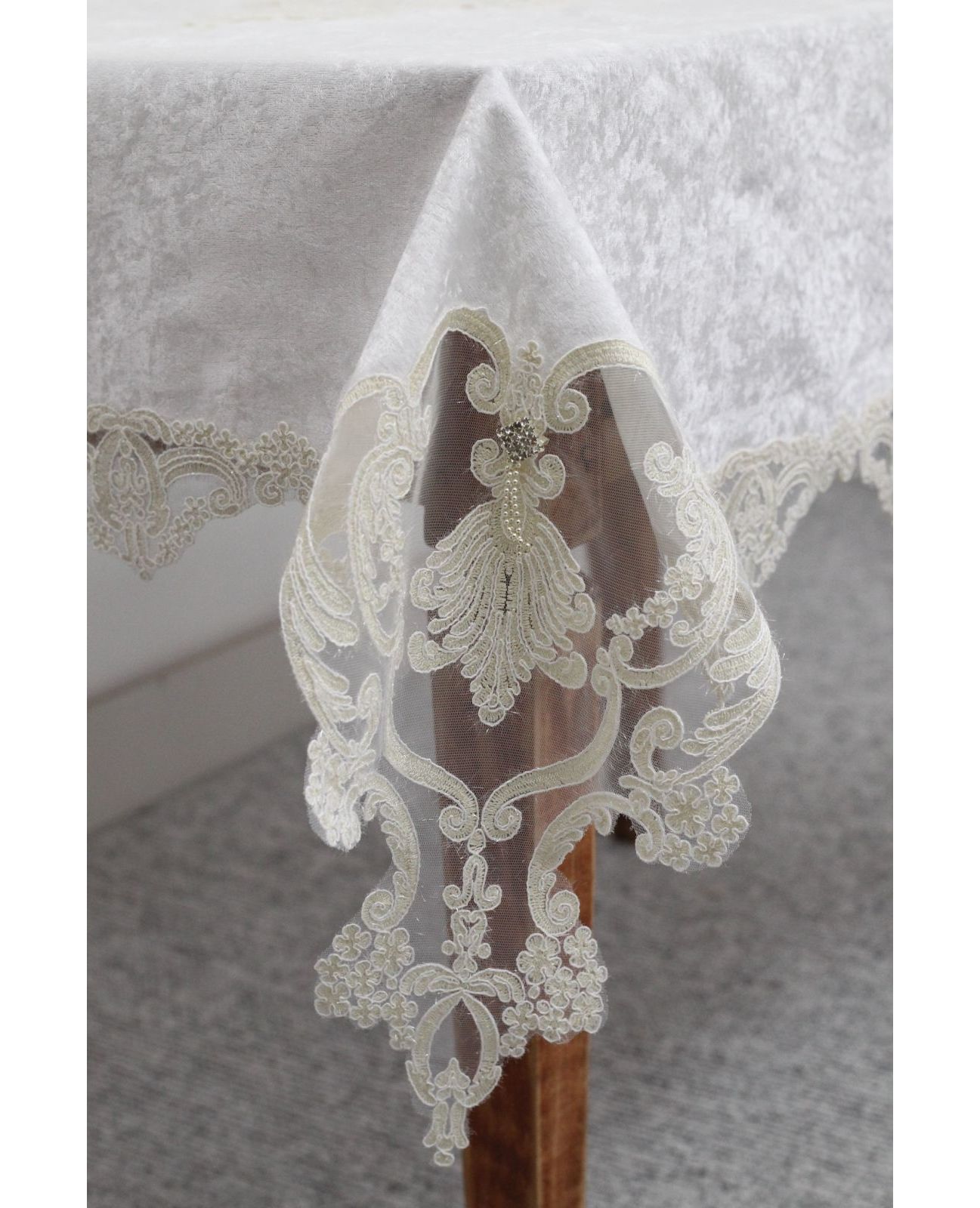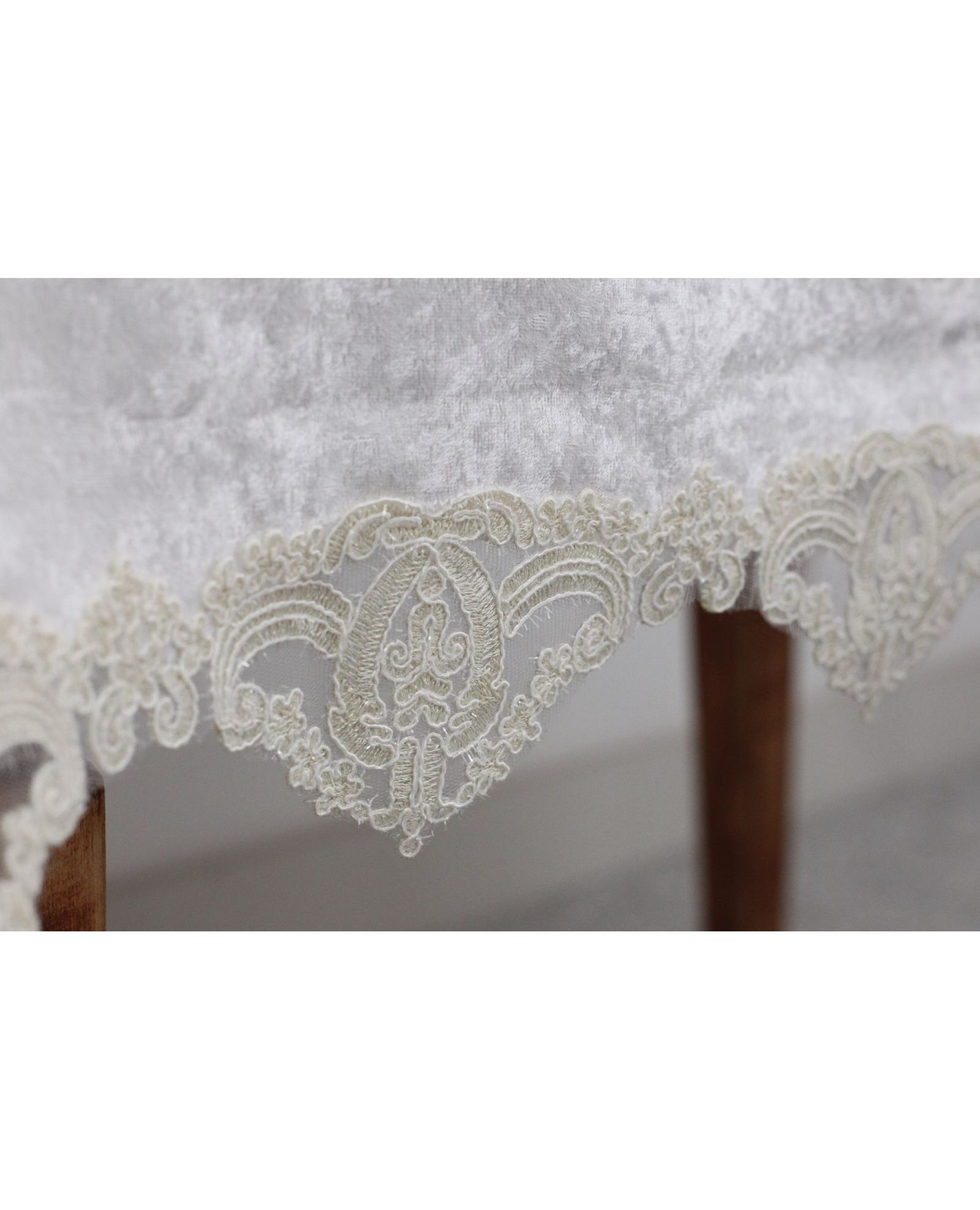 Скатерть 150х350 см — стильная и элегантная деталь для вашего интерьера. Бархатный материал молочного цвета придает роскошь, а кружево по середине и краям создает утонченный вид. Волнистые края подчеркивают нежность и красоту этой скатерти. Идеально подходит для праздничных мероприятий и создания особой атмосферы в вашем доме.