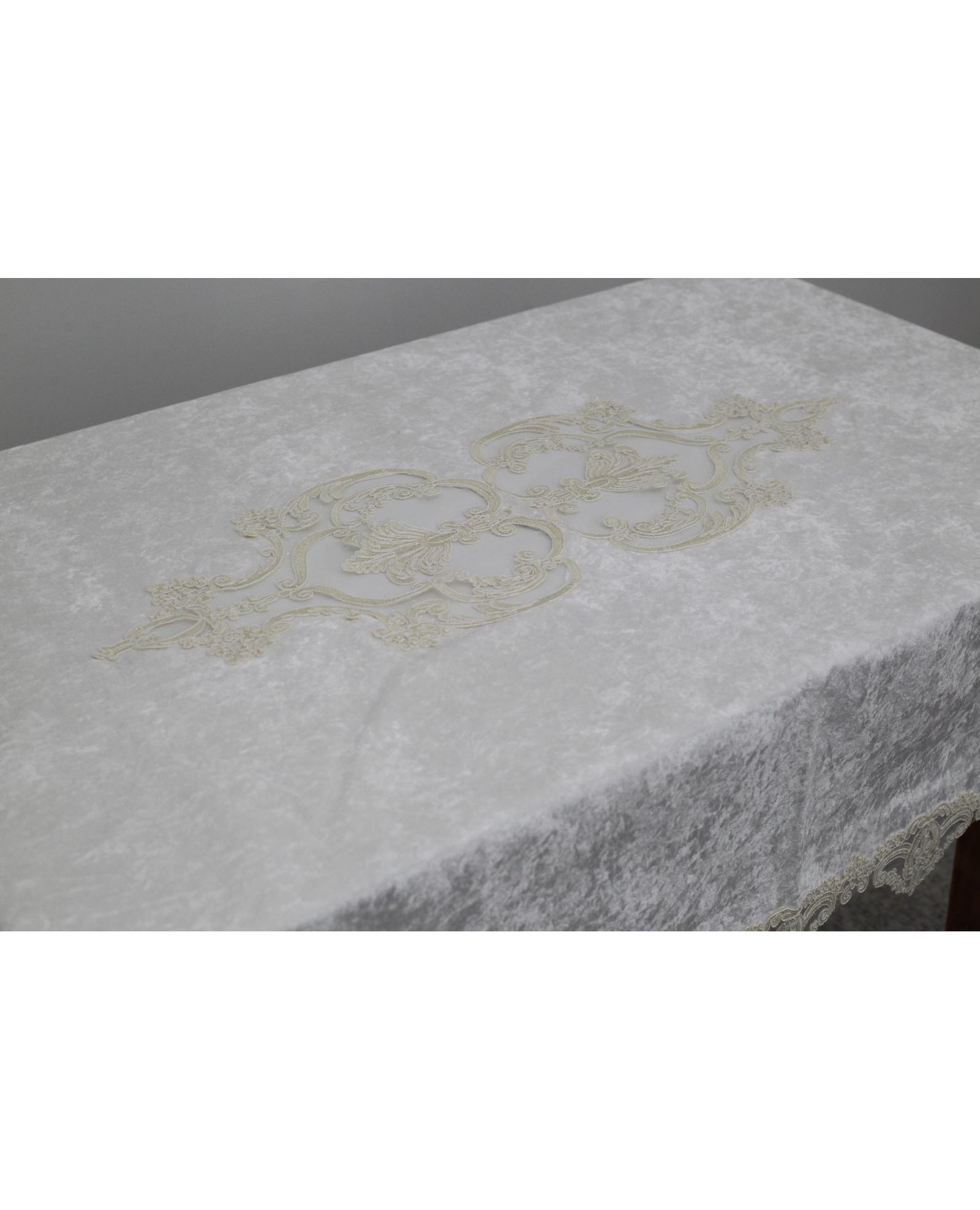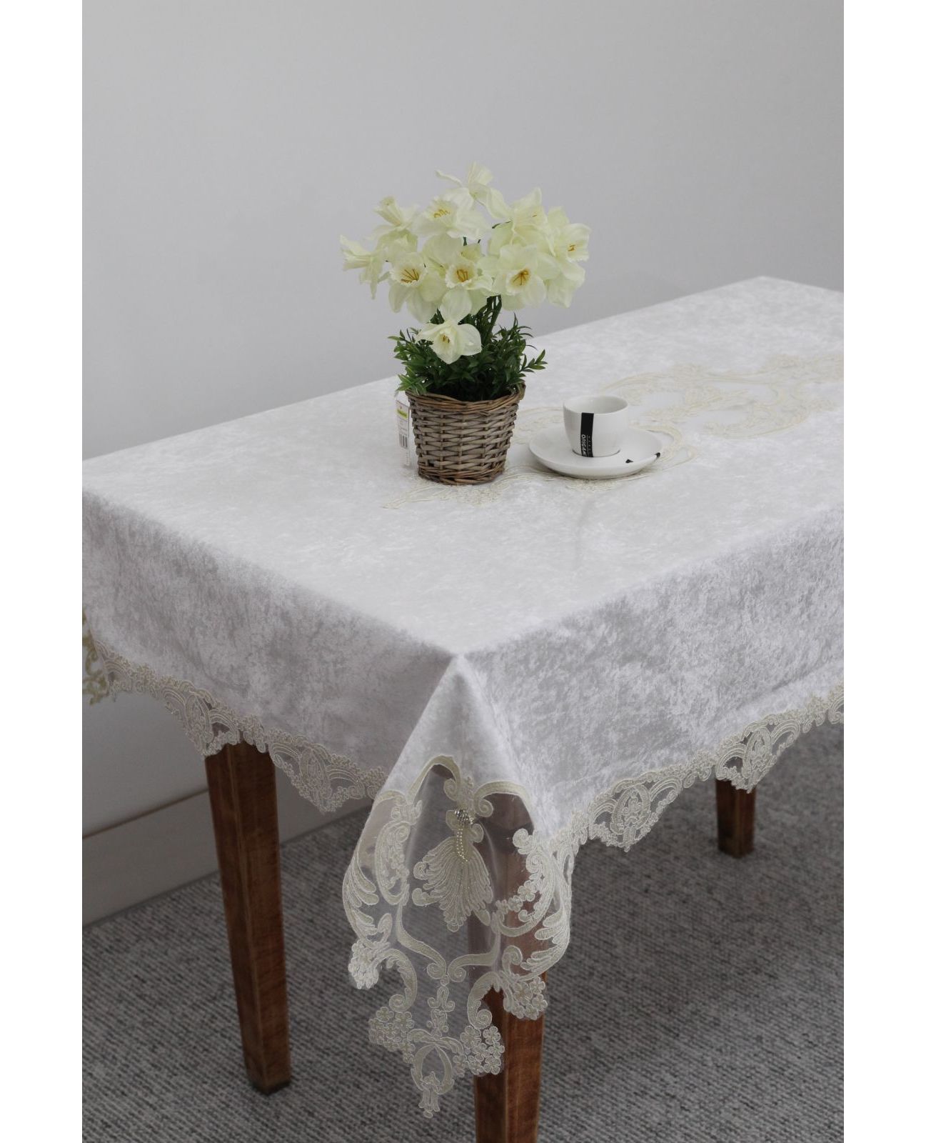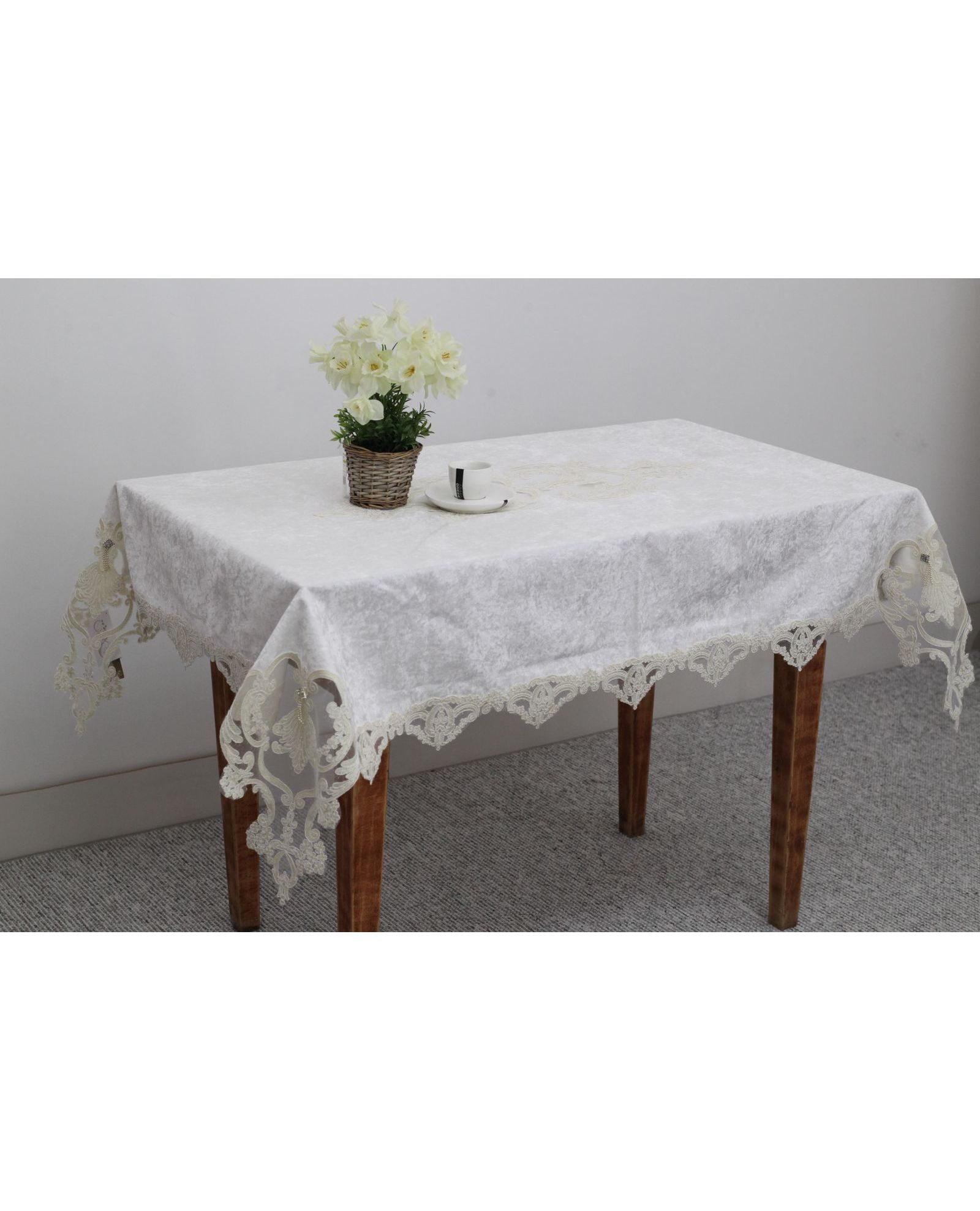 Скатерть 150х350 см — стильная и элегантная деталь для вашего интерьера. Бархатный материал молочного цвета придает роскошь, а кружево по середине и краям создает утонченный вид. Волнистые края подчеркивают нежность и красоту этой скатерти. Идеально подходит для праздничных мероприятий и создания особой атмосферы в вашем доме.