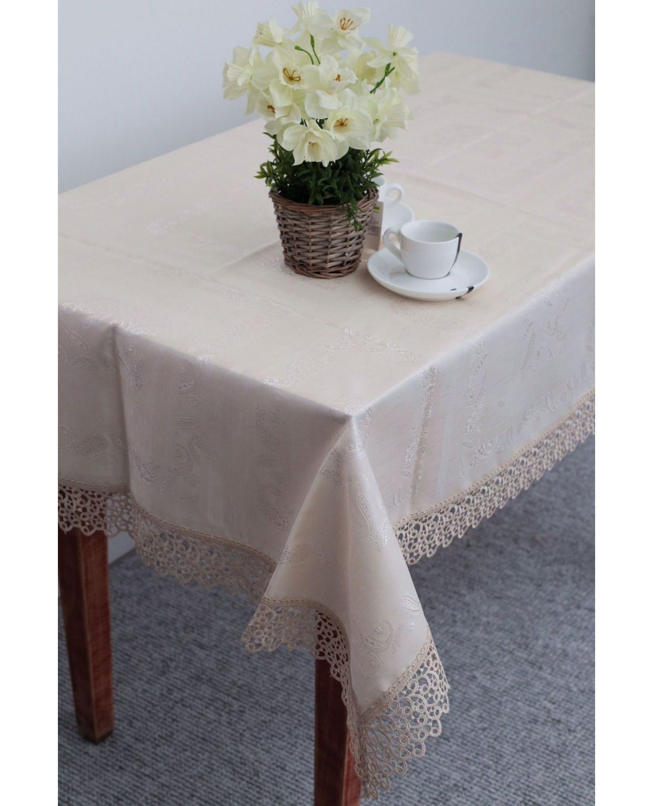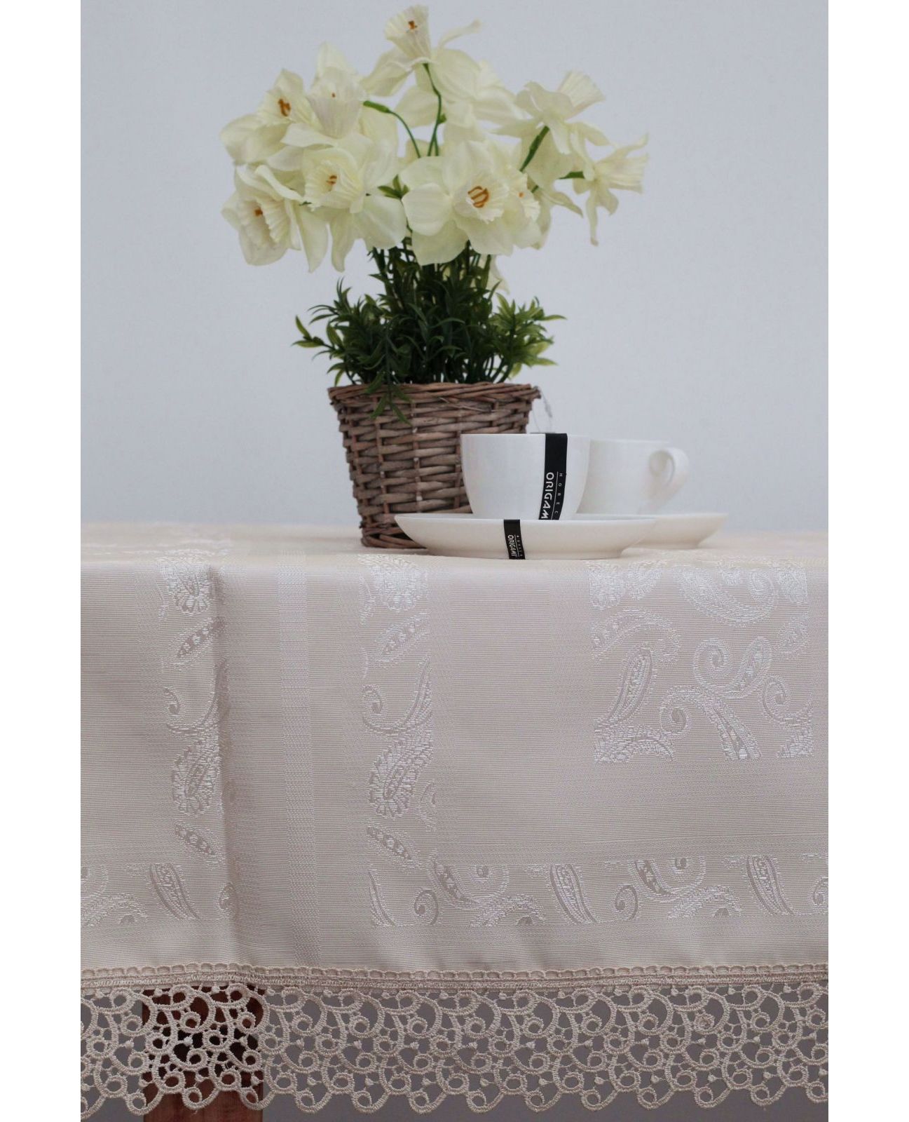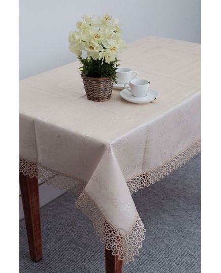 Скатерть 160х350 см — изысканное украшение для вашего стола, сочетающее элегантность и практичность. Выполненная из качественного полиэстера бежевого цвета, она украшена нежным кружевом по краям, придавая интерьеру уют и стиль. Идеальный выбор как для праздничных мероприятий, так и для повседневного использования.