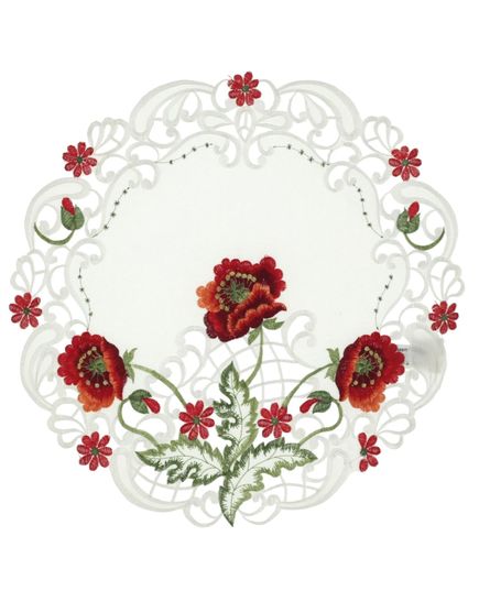 Кругла серветка класичного білого кольору прикрашена вишуканими вишитими квітами. Вона стане стильним елементом сервірування, який додасть ніжності та святковості вашому столу. Ідеальний вибір як для буднів, так і для особливих подій.