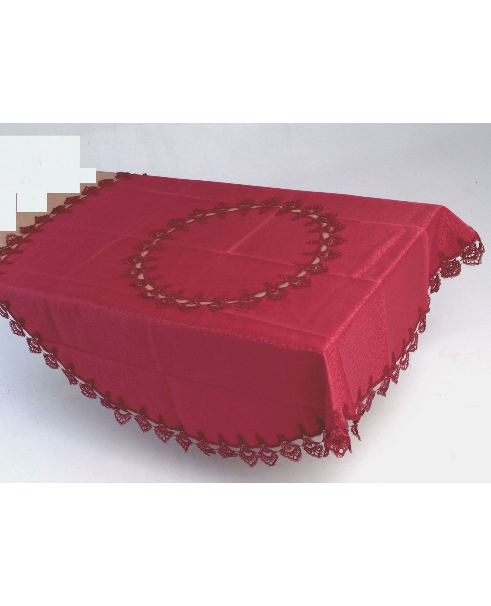 Надайте вашому інтер’єру особливого шарму з вишуканою скатертиною бордового кольору. Оздоблена ніжним мереживом і хвилястими краями, ця скатертина стане елегантною прикрасою вашого столу, створюючи атмосферу затишку та вишуканості. Виготовлена з якісного поліестеру, вона проста у догляді та довговічна.