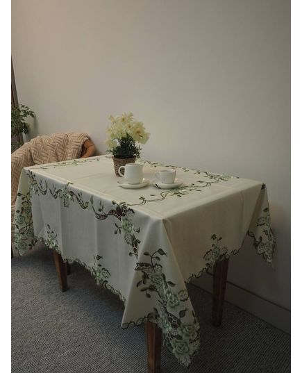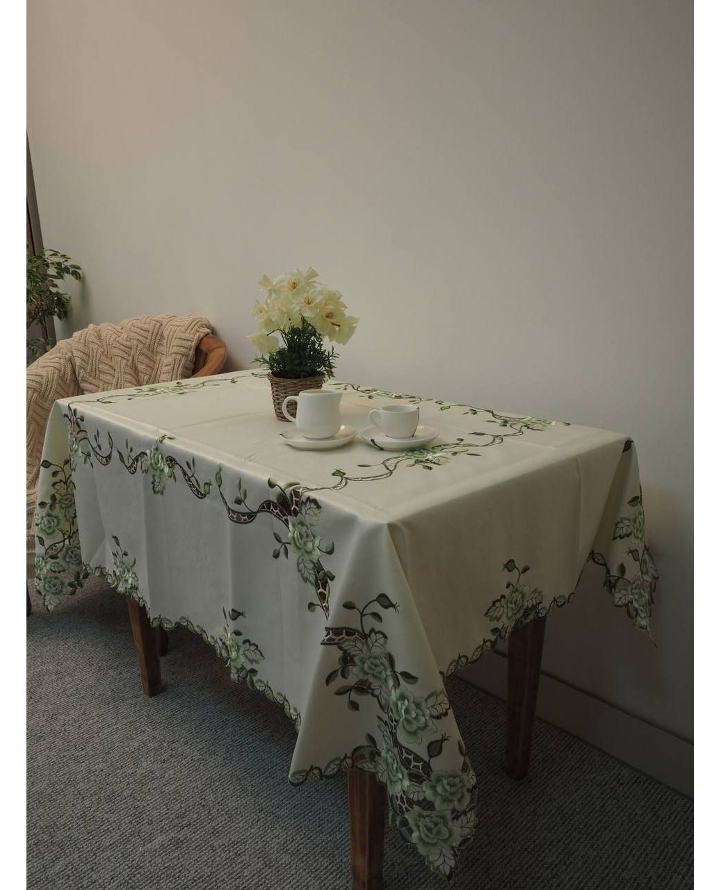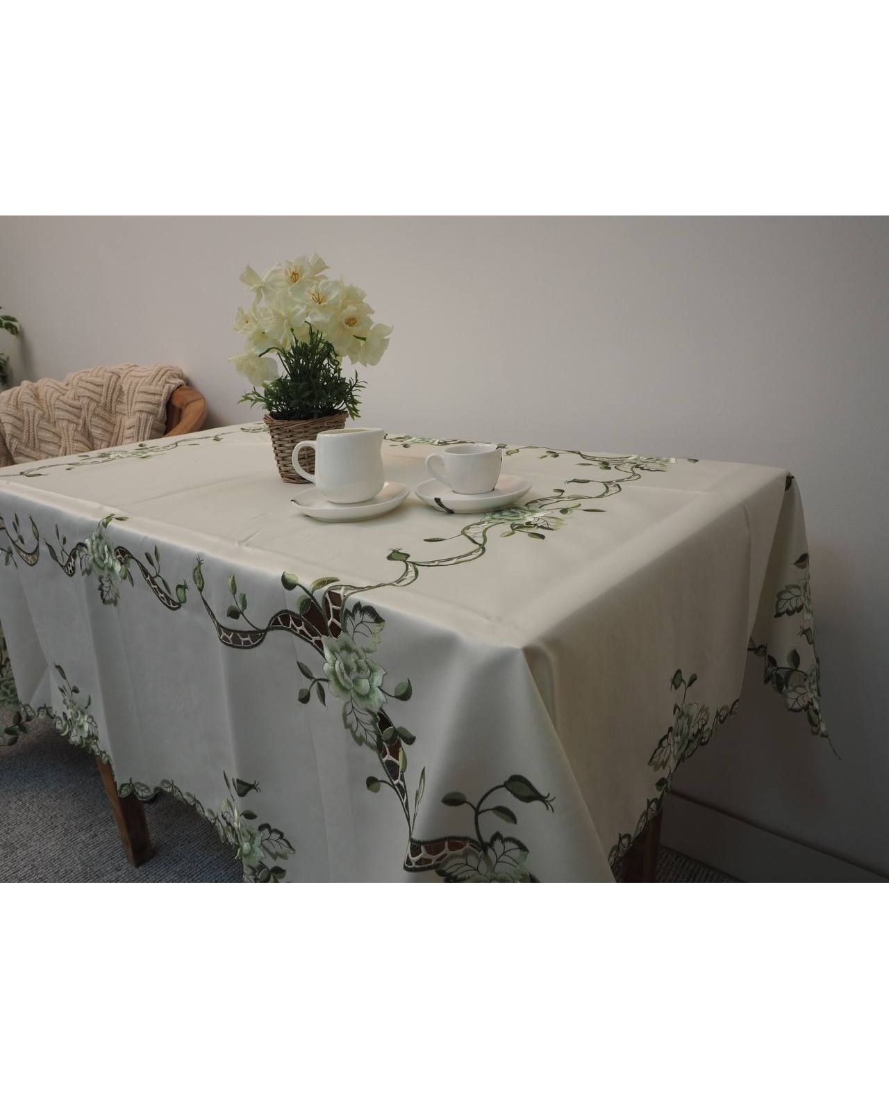 Скатертина 130×170 см молочного кольору з вишитими зеленими квітами – вишуканий акцент для вашого столу