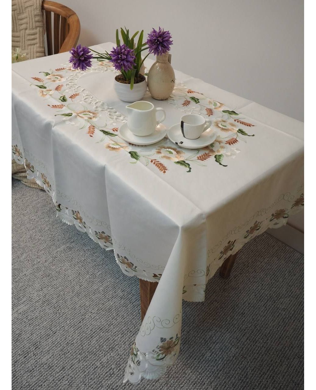 Ця елегантна скатертина розміром 130x170 см має коричневий колір і вишивку по середині та краях, що надає виробу особливого шарму. Хвилясті краї додають витонченості та легкості. Виготовлена з 100% поліестеру, скатертина є міцною, стійкою до зношування та легко чиститься, зберігаючи свій вигляд після багаторазових прань.
