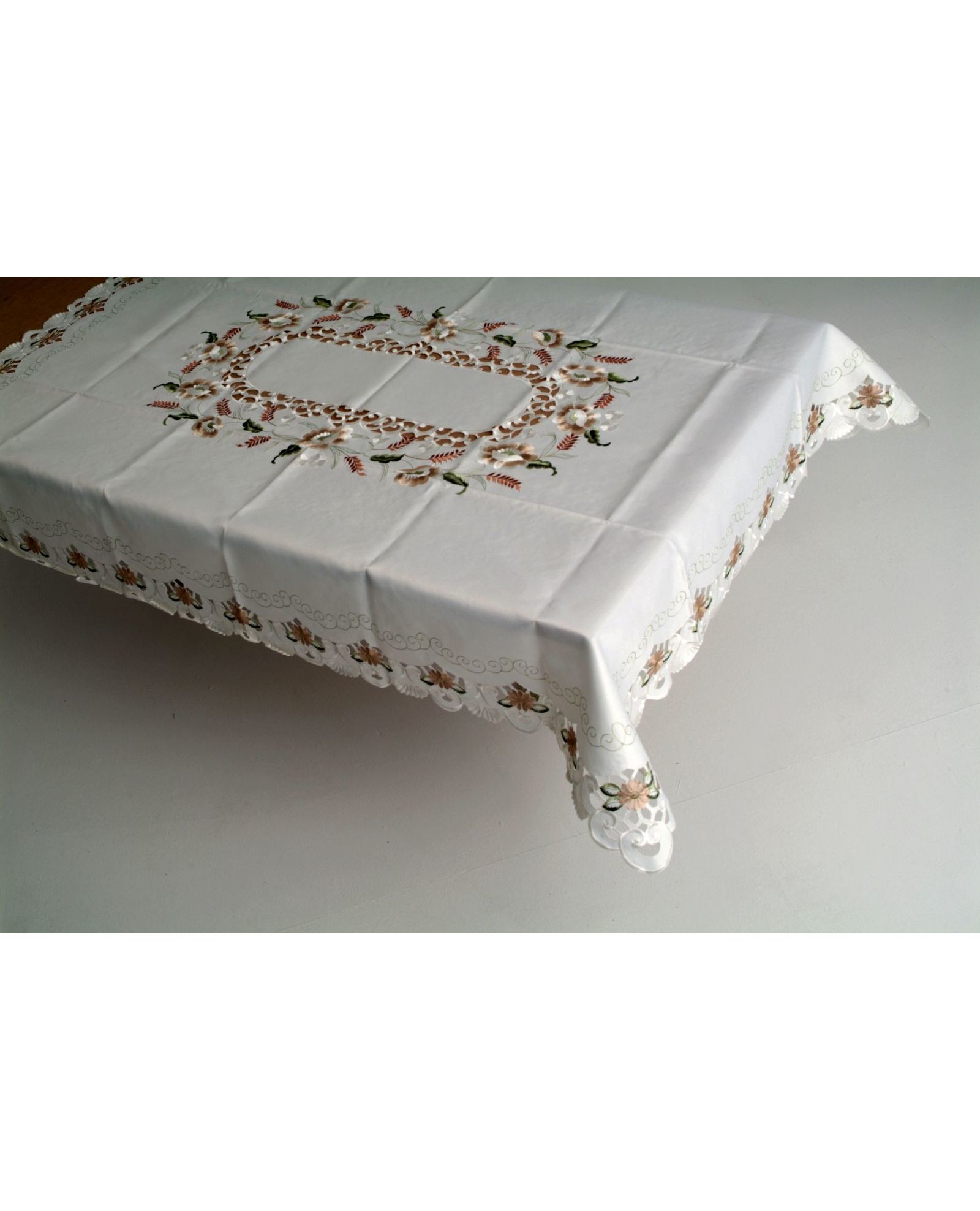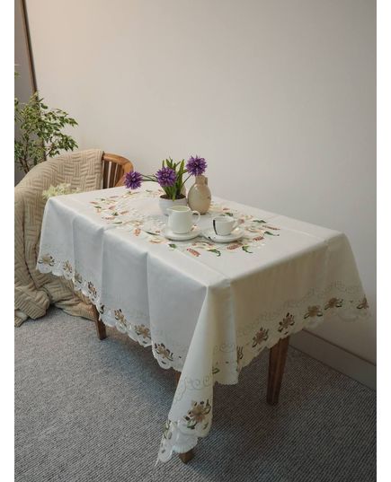 Скатертина бежевого кольору з вишивкою по середині та краях, з хвилястими краями
