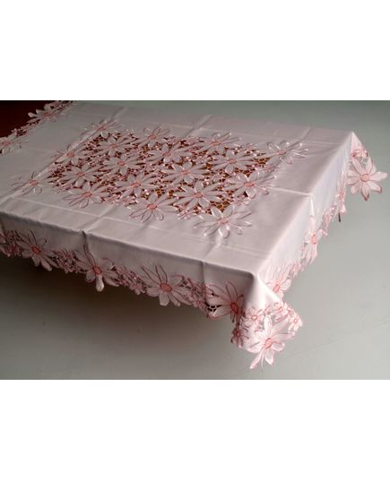 Вишукана скатертина рожевого кольору стане стильним доповненням вашого інтер’єру. Оздоблена ніжною вишивкою квітів та елегантними хвилястими краями, вона створює атмосферу затишку та святковості. Виготовлена з якісного поліестеру, що забезпечує довговічність і простоту у догляді.
