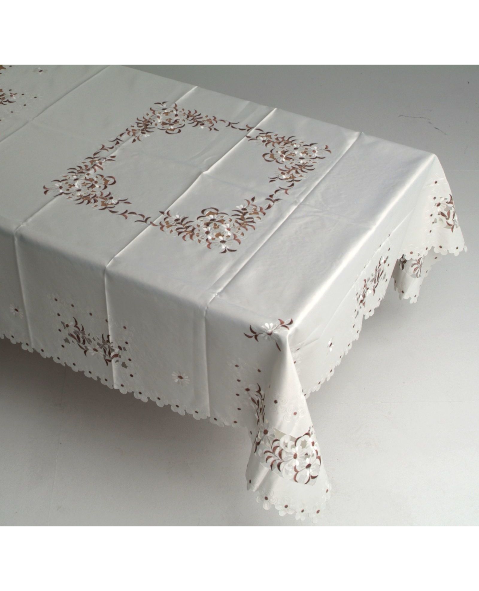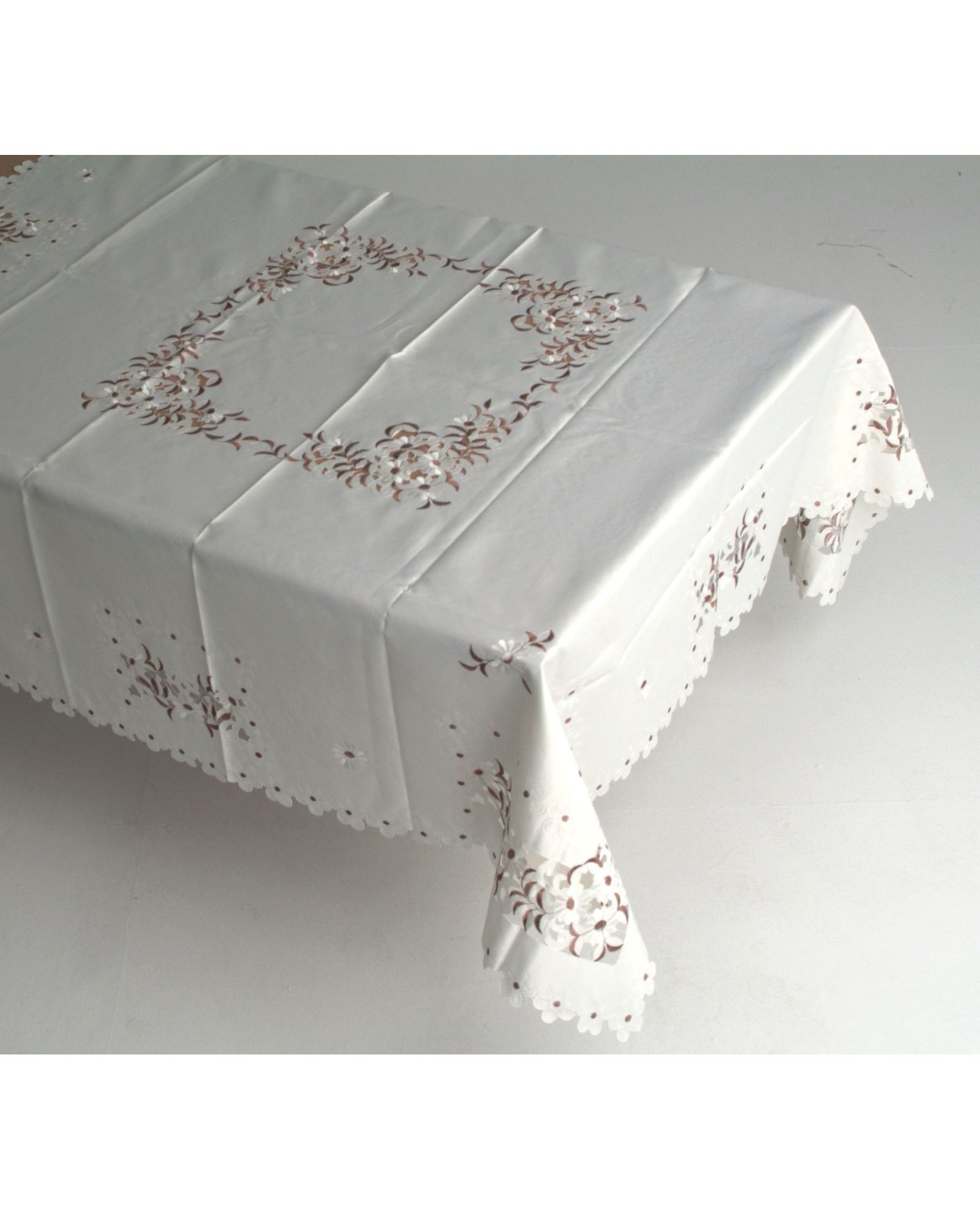 Вишукана скатертина білого кольору з ніжною вишивкою квітів стане чудовою окрасою вашого столу. Хвилясті краї додають витонченості, а якісний поліестер забезпечує довговічність і легкість у догляді. Ідеальний вибір для святкових подій та повсякденного використання.