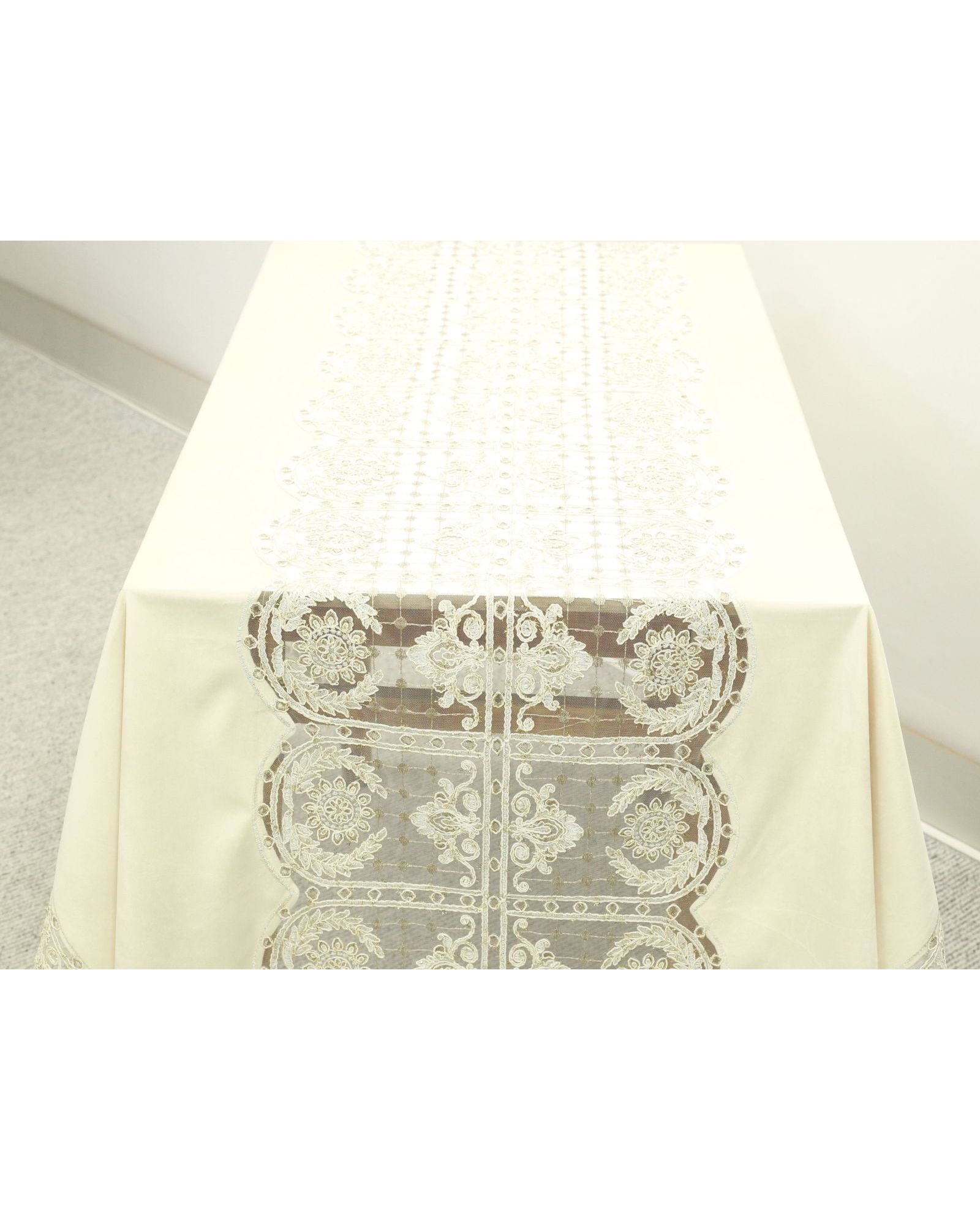 Виготовлена з оксамиту 100% бежевого кольору, вона має оригінальне оздоблення мереживом по середині та краях, а також вишукану золотисту нитку, що додає виробу розкішного вигляду. Це ідеальний вибір для створення стильного та елегантного інтер'єру.