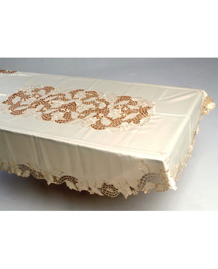 Елегантна бежева скатертина з мереживом по краях ідеально підходить для овального столу. Вона додає атмосфері вашого дому тепла і затишку, поєднуючи класичний стиль з витонченістю. Завдяки використанню 100% поліестеру, ця скатертина є довговічною та стійкою до зношування. Вона легко доглядається, зберігаючи свою красу навіть після численних прань.