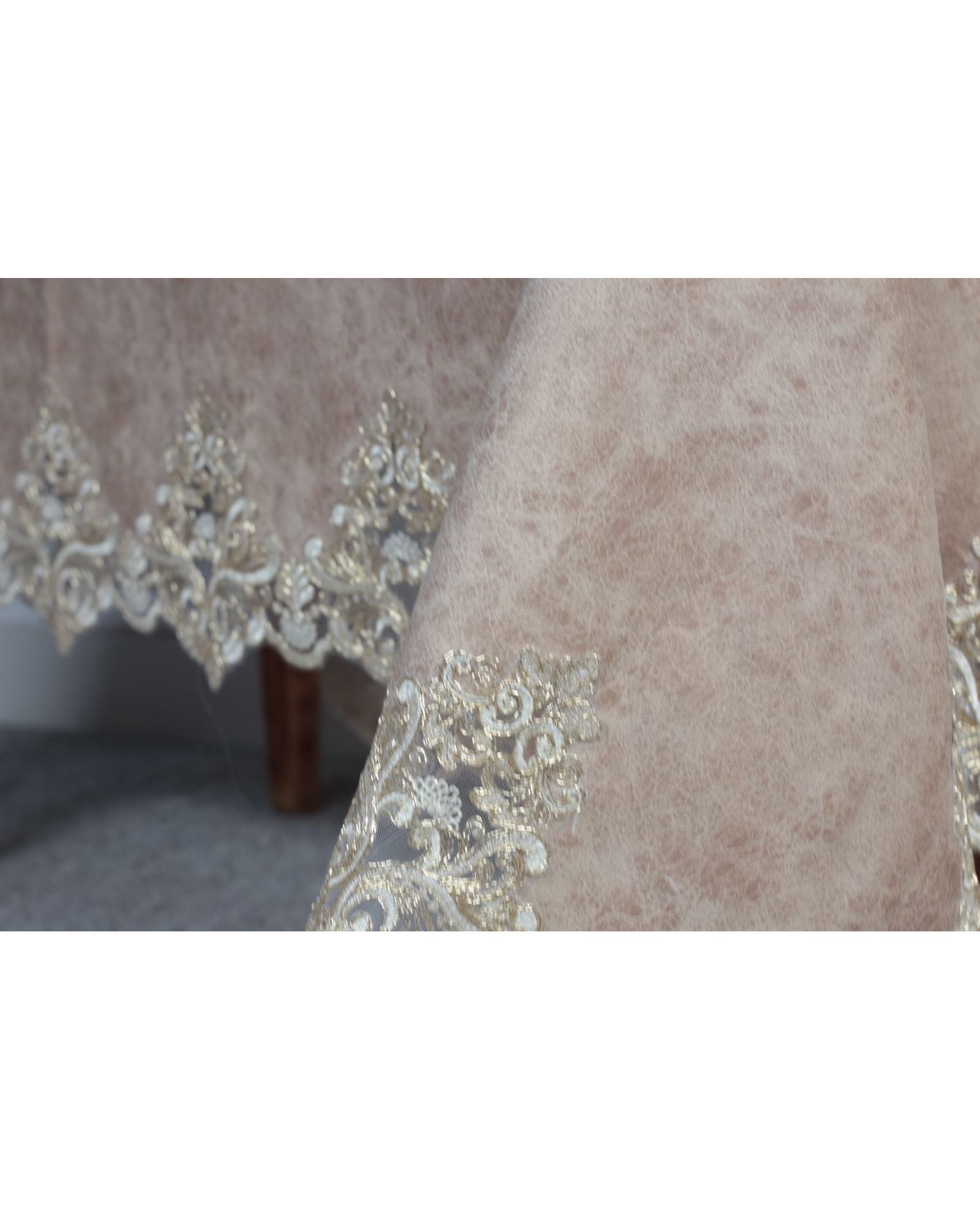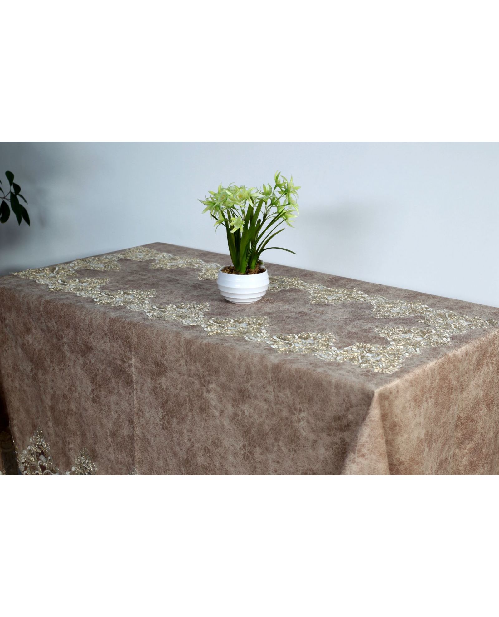 Додайте вишуканості вашому інтер’єру з елегантною скатертиною насиченого коричневого кольору, оздобленою розкішним золотистим мереживом по краях. Поєднання теплих відтінків створює атмосферу затишку та благородства, ідеально підкреслюючи стиль вашої оселі чи святкового столу. Виготовлена з 100% поліестеру, ця скатертина вирізняється міцністю, довговічністю та легкістю у догляді. Турецька якість гарантує увагу до деталей та акуратне виконання.