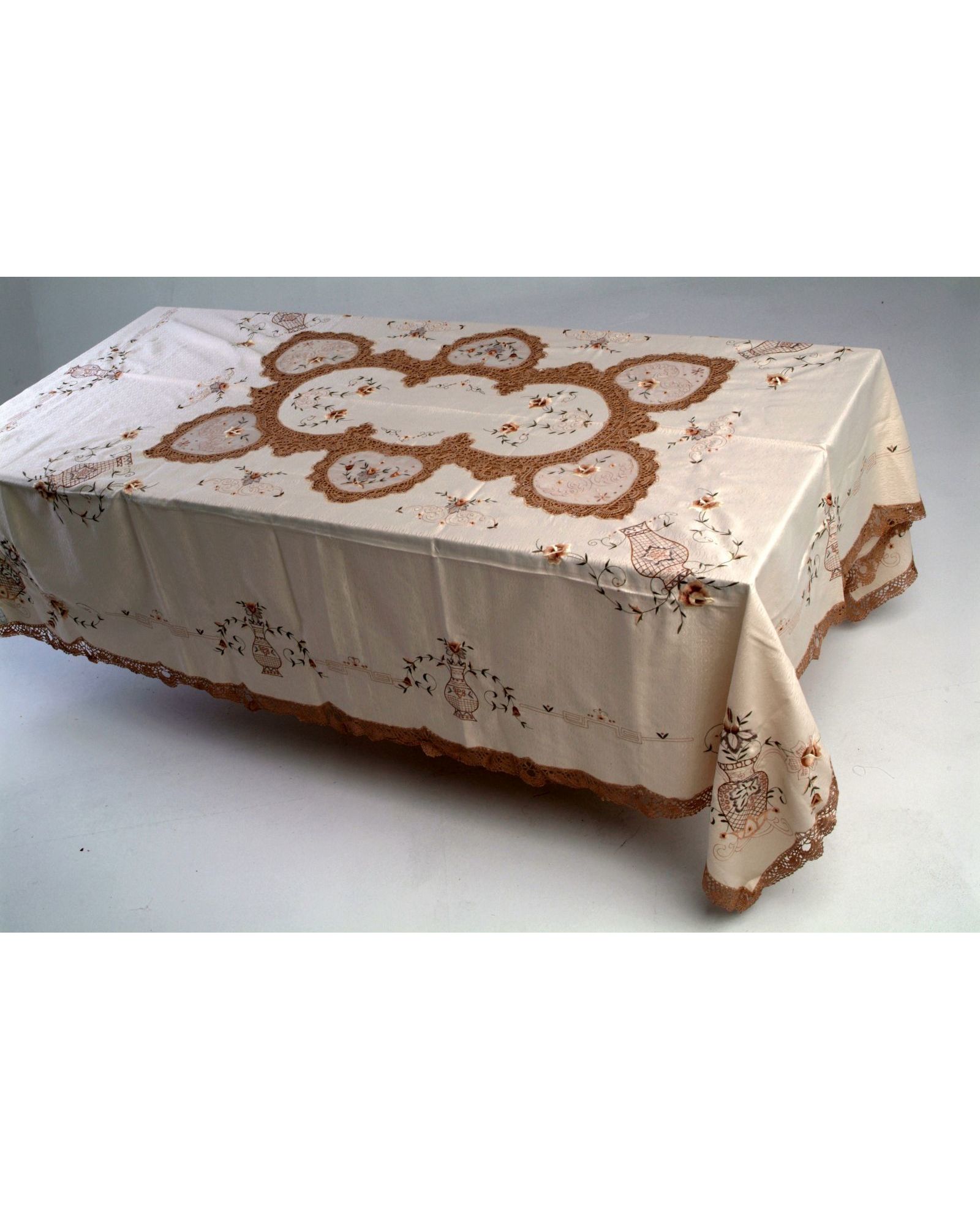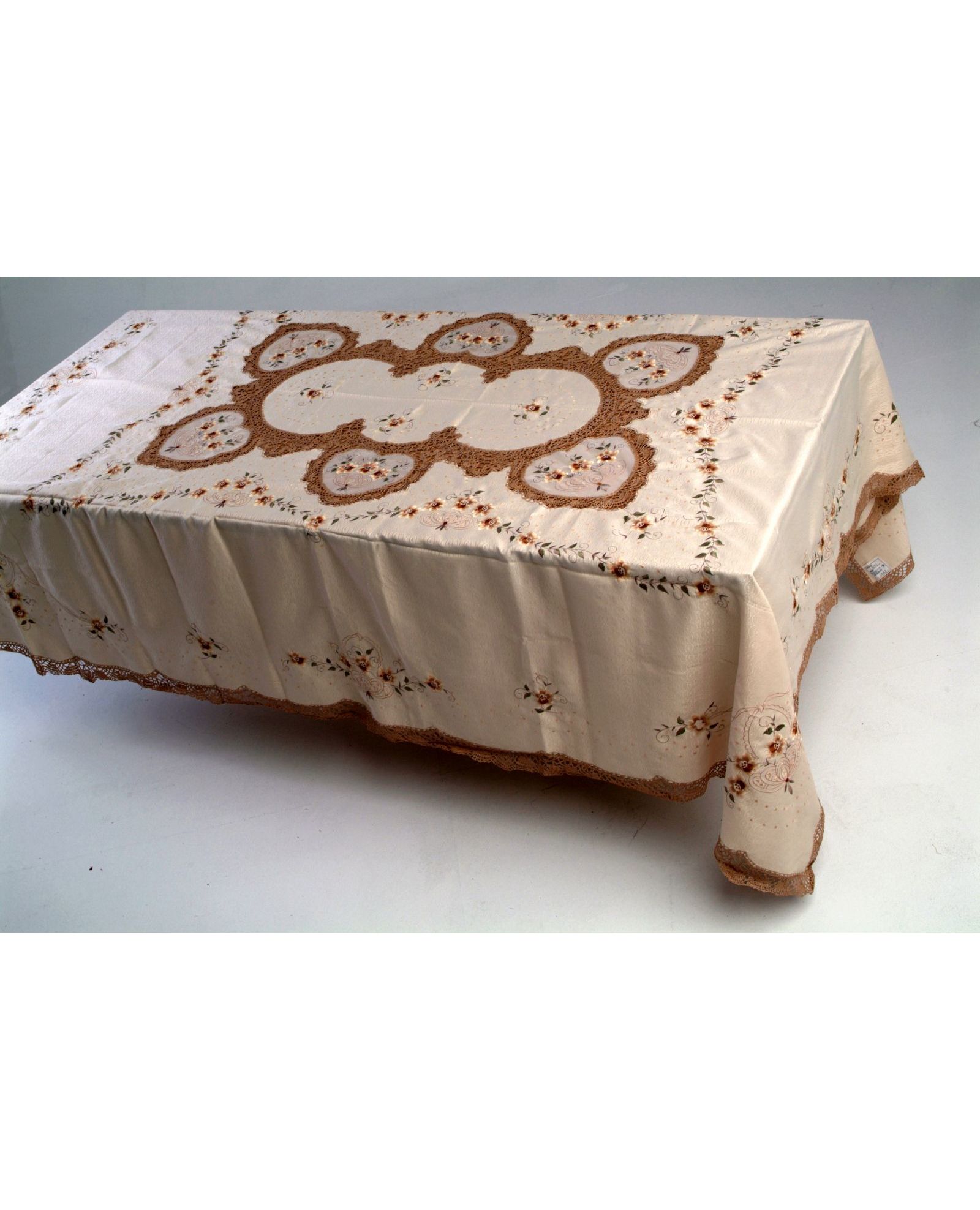 Бежева скатертина 180х225 см із вишитими квітами та мереживом — елегантність у кожній деталі