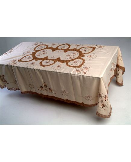 Бежева скатертина 180х225 см із вишитими квітами та мереживом — витонченість у кожній деталі
