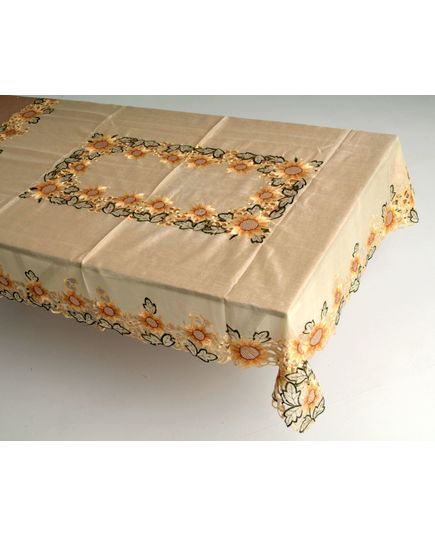Скатертина 160х220 см з вишитими квітами соняхів та хвилястими краями — жовтого кольору