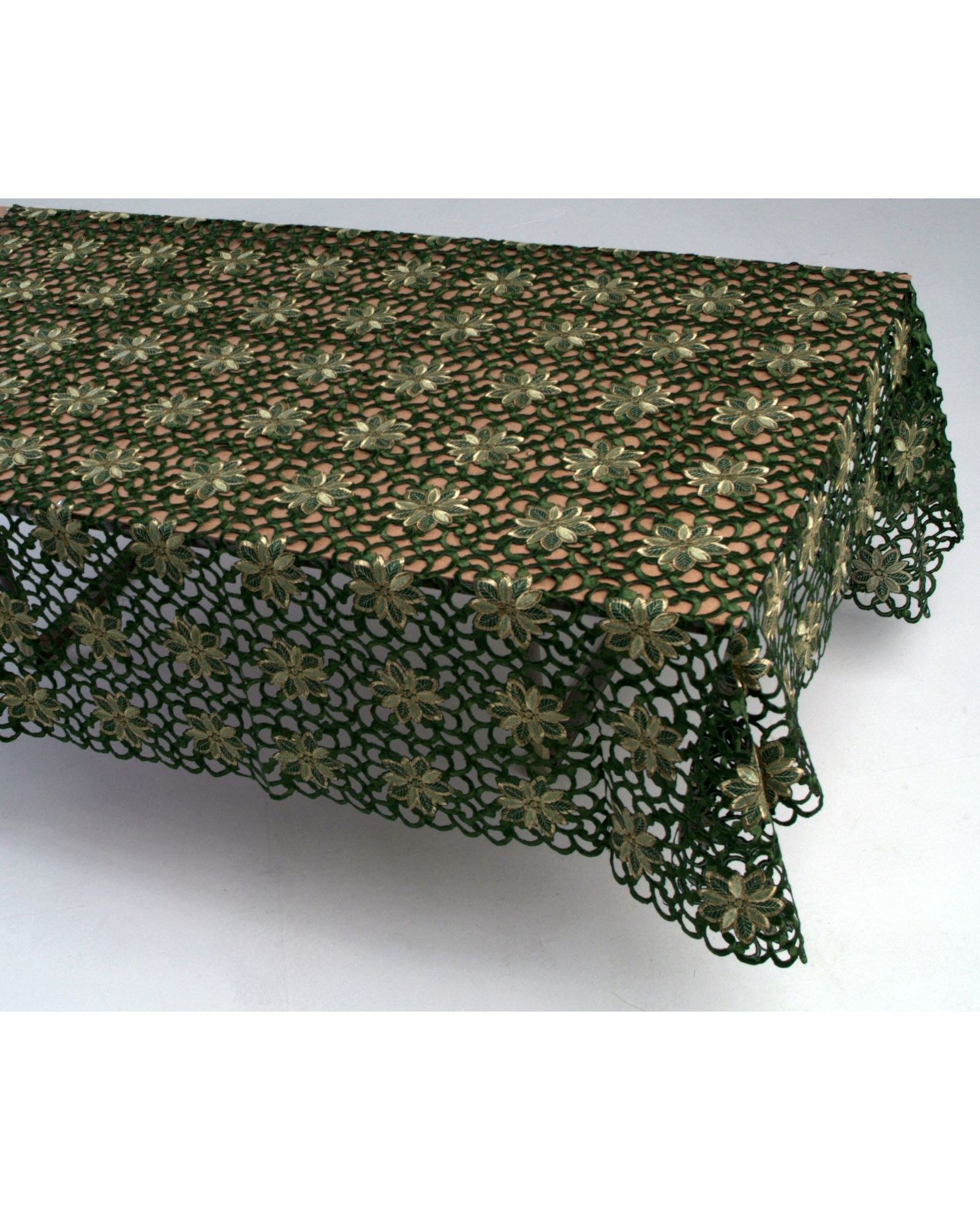 Ця стильна скатертина зеленого кольору стане чудовим доповненням вашого інтер'єру. Ажурний матеріал надає легкості, а вишиті золотистою ниткою квіти додають елегантності та розкоші. Хвилясті краї підкреслюють її витончену красу. Виготовлена з 100% поліестеру, вона не лише красива, але й практична — не мнеться та легко доглядається.