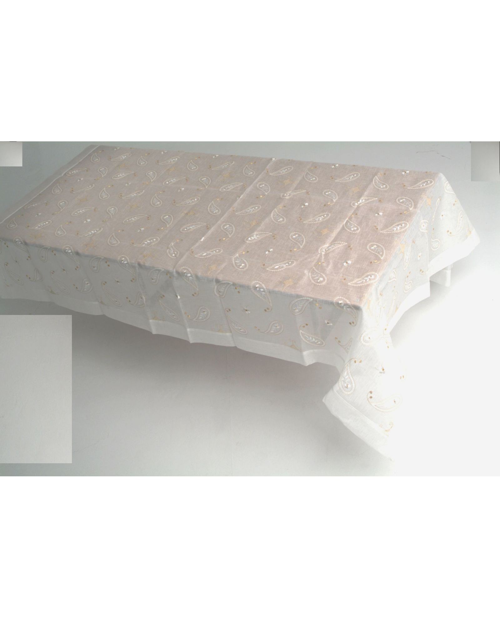 Скатертина 160х220 см з вишивкою золотистою ниткою — прозора, білого кольору