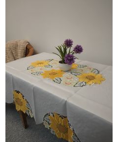 Скатертина білого кольору з вишивкою соняшника Елегантна скатертина білого кольору, прикрашена яскравою вишивкою соняшника, стане чудовим доповненням до вашого столу. Вона надасть інтер’єру тепла й затишку, створюючи атмосферу гостинності. Завдяки 100% поліестеру скатертина міцна,...