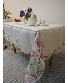 Скатертина молочного кольору з вишивкою квітів та хвилястими краями Ця елегантна скатертина розміром 130x170 см чудово доповнить будь-який інтер'єр. Молочний колір тканини поєднується з ніжною квітковою вишивкою, а хвилясті краї додають виробу витонченості та стилю. Виготовлена з...